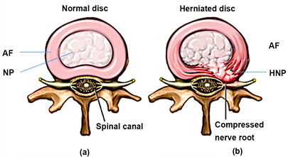 디스크는 내부에 수핵(Nucleus Pulposus, NP), 외부에 섬유륜(Annulus Fibrosus, AF)으로 구성되어 있다. 올바르지 않은 자세, 허리에 부담이 가는 자세 등으로 작은 손상이 중첩되면 후방 섬유륜은 조금씩 찢어진다. 시간이 지나면 위 사진처럼 수핵이 뒤로 밀려 척수 혹은 신경뿌리를 누르고 화학반응을 일으킨다.