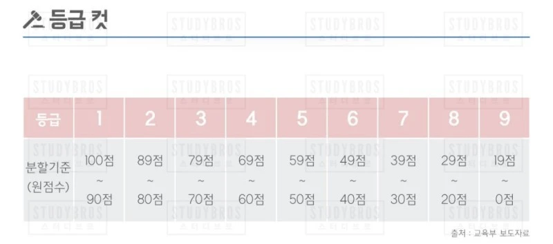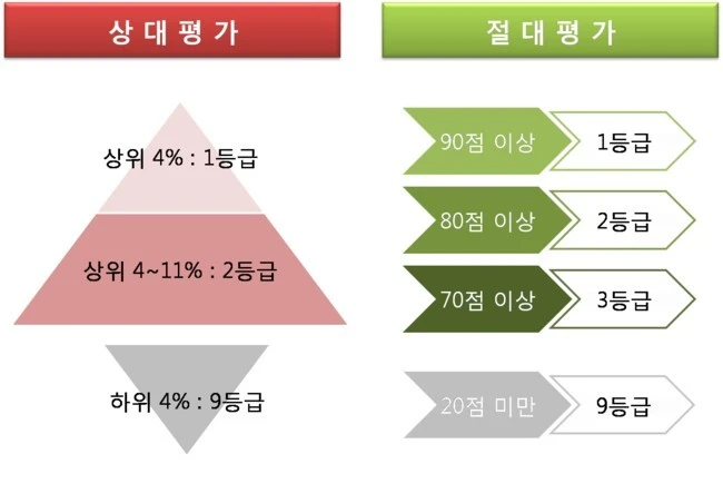 절대평가로 전환되면서 영어는 다음과 같은 분할점수를 설정했다. 즉, 90점 이상을 받으면 모든 학생이 1등급을 취득하게 되는 것이다. 애초에 이러한 준거를 설정하는 것에는 고도의 전문성이 요구되고, 시험과 상황 변수에 따라 점수 해석에 자의성이 높다는 비판을피할 수 없다.