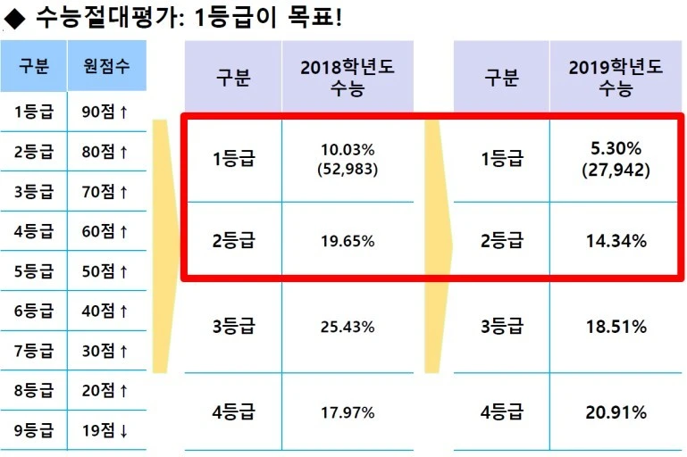 즉, 교육부는 이미 영어를 절평으로 돌린 그 순간부터 영어 과목에서의 변별력을 줄이겠다는 의지를 보인 셈이다. 실제로 수능 영어 절대평가가 처음 시행된 2018년도는 이런 현상이 극대화되어 학습자 개인 간의 상대적 우열을 비교하기가 매우 어려웠다. 1등급을 4%로 측정한 기존 상대평가 등급과 달리 그 해는 10%가 넘는 학생이 영어에서 1등급을 받았기 때문이다.