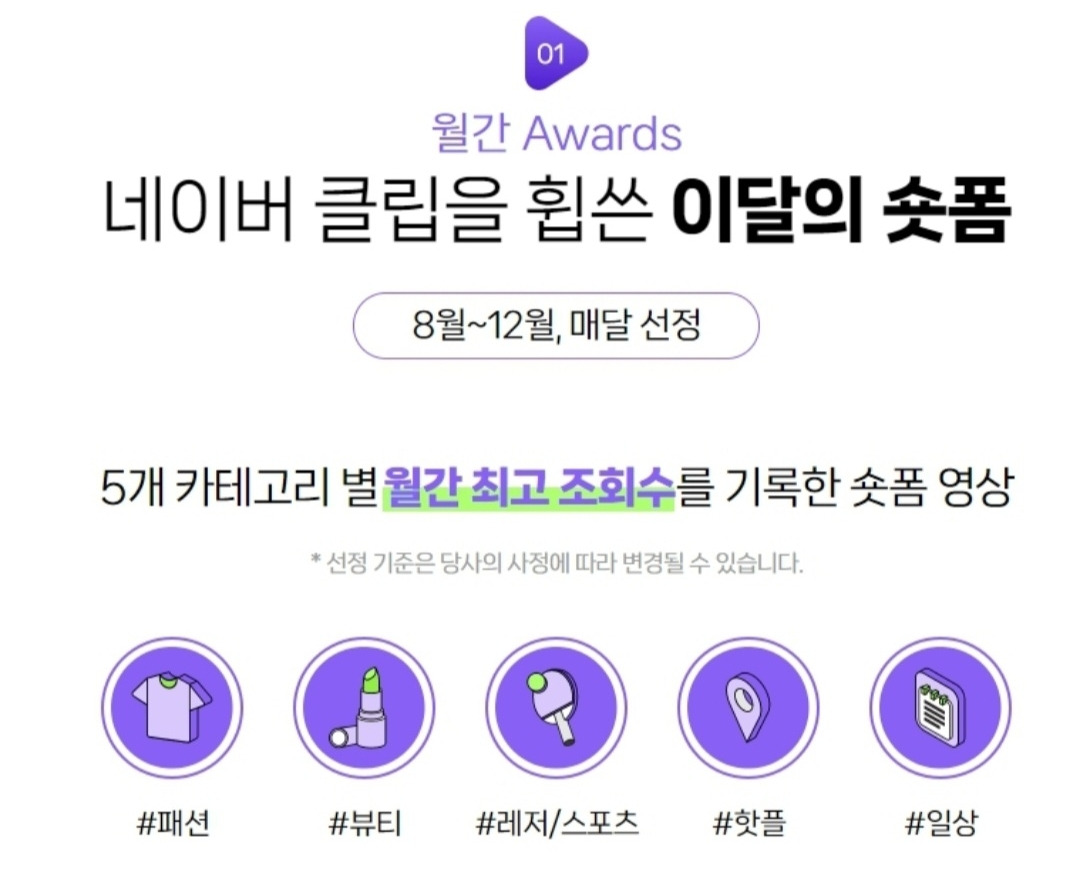 파워블로거로서 네이버 숏폼 크리에이터를 모집 공고를 보고 가장 먼저 든 생각은 '아 진짜 네이버스럽다'였다. 알차게 나눠놓은 저 다섯 개의 카테고리를 보시라.