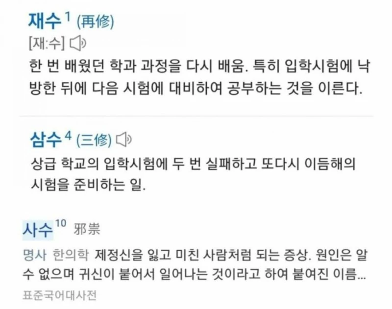 삼수: 학원 선생님들이 그 어떤 조언을 해도 '그렇지 그럴 수도 있지...' 한다. 그들에게 건방짐이란 이미 오래전 증발해 찾아볼 수 없다.그걸 알아서 선생님들은 삼수생이라고 하면 오히려 잔소리를 더 안 하는 경향이 있다. 문제 하나라도 더 챙겨주시고 거의 응원만 해준다. (물론 성실한 학생 기준)