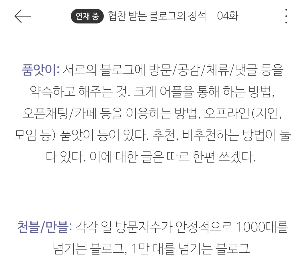 여기에 공통적으로 말씀드리고 싶은 것은 블로그 초창기(셀프 창작 게시물이 10개 미만/ 첫 게시물 올린 지 한 달 이하), 이 시기에는 아직 품앗이는 비추천한다는 점. 개인 콘텐츠 제작에 더욱 몰두하자.