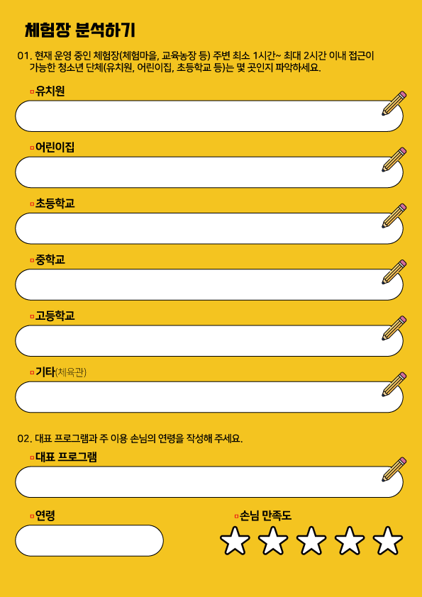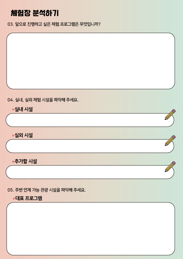 첫 번째 질문은 현재 운영 중인 곳의 시장성을 보는 것입니다. 최소 1시간~2시간 이내 접근에 가능한 청소년 단체를 찾아보는 것입니다. 이 단체는 바로 우리 마을, 농장을 찾아줄 잠재적 고객입니다. 앞으로 만들어질 프로그램을 홍보할 곳이 됩니다. 청소년 단체들의 외부활동은 점점 가까운 거리를 선호하고 최소한의 이동을 하게 될 것입니다. 또한 소규모로 체험 진행을 하게 될 것입니다.