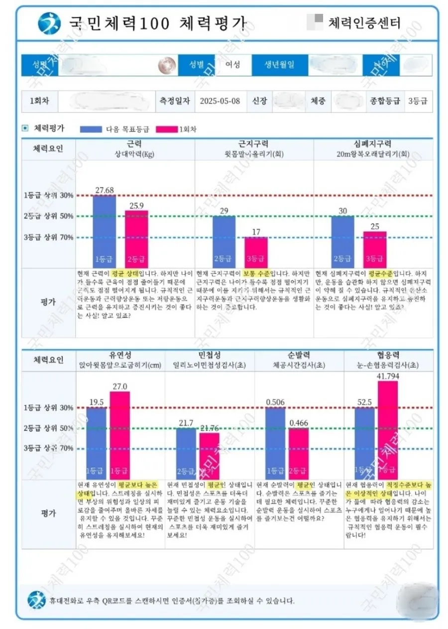 내가 체검(국민체력100)을 위해서 매일 밤 학교 캠퍼스를 뛰어다녔는데 그게 헛되지 않았던 것 같다 ㅋㅋㅋㅋ 왕복오래달리기랑 윗몸일으키기가 제일 약해서 그 두개만 집중적으로 연습했는데 미성년자 달란트(생일 안 지난 만 18세 ㅎㅎ) 덕분에 윗몸일으키기는 팔을 엑스자로 만들고 하는 거 대신에 손만 무릎위로 올라갔다 내려갔다 하는 방식으로 측정했다. 미자 아니었으면 윗몸일으키기 한개도 못해서 진짜 개쪽 당할 뻔;; 다른 종목은 다 괜찮은데 이것만 극단적으로 못해서 앞으로 계속 연습해야 될 것 같다.