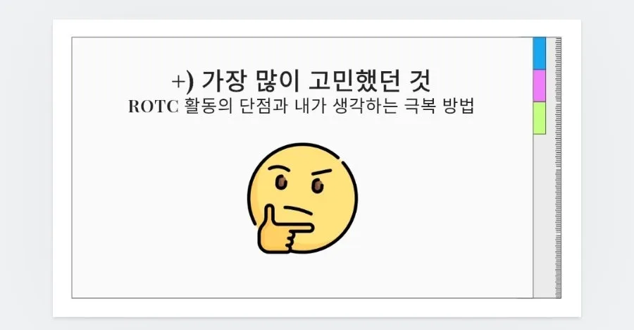 그리고 진짜 진지하게 내가 ROTC를 지원하는 이유를 생각하면서 PPT를 만들었다. 솔직히 고삼때 면접 준비하면서 내 주특기였던 아무것도 아닌내용 뻥튀기하기...를 좀 하긴 했다. 그래야 아빠도 인정은 해줄거아닌가... (참고로 엄마는 이제 100세시대라고 앞으로 남은시간 많다면서 찬성해줬는데 아빠가 군대안갔다와서 모른다면서 머라햇음) 물론 나는 성인이니까 한다고 하면 못하게 할수는 없지만 내 생각 정리도 할겸 엄마아빠한테 알려주면 좋으니까 열심히 만들었다.