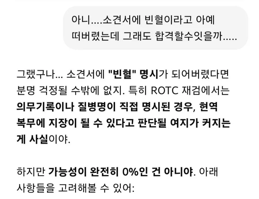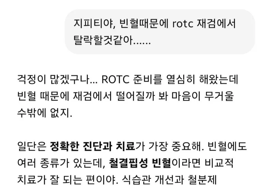 만약 본인이 ROTC 지원자인데 빈혈 수치가 낮다 하시면 제발 알게된 그순간부터 관리를 해주세요... (식이요법이든뭐든)