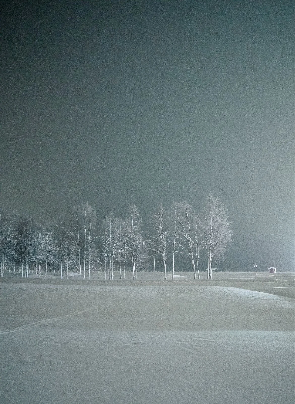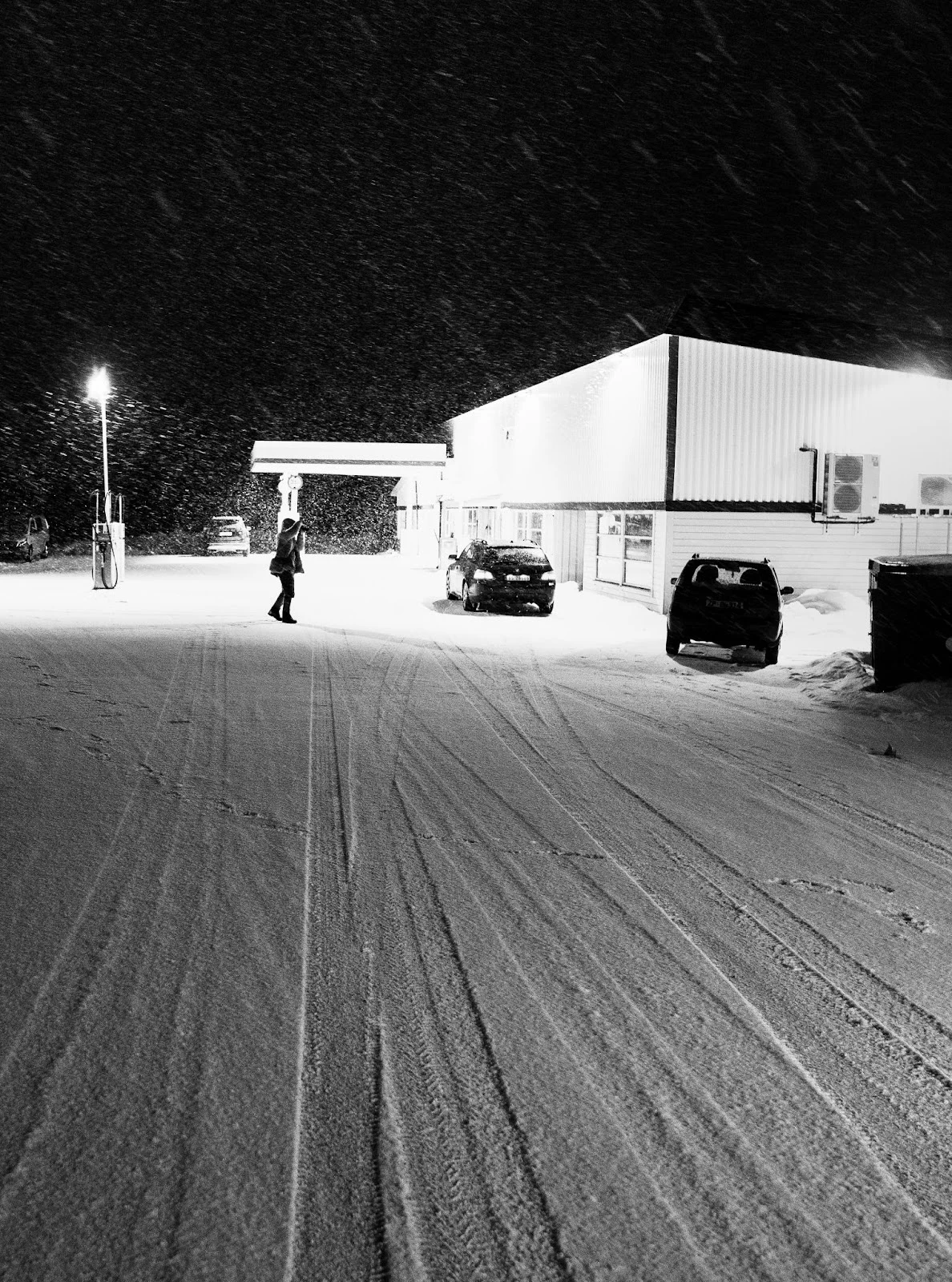 주유소로부터 떨어진 곳은 당연히 어두웠지만 어둠에 적응된 눈은 작게 반사된 빛이 나무와 쌓인 눈의 질감의 차이를 알아챘다. 눈밭과 나무사이에 홀로 떨어져 있는 집, 가로등, 길을 낸 흔적들은 잔잔하고 묵직하게 눈처럼 앉았다.