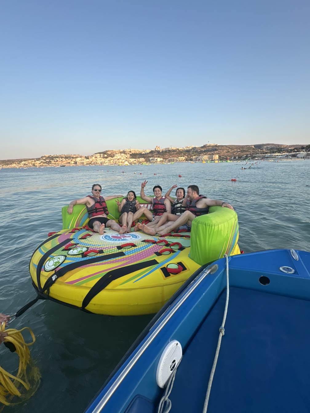 처음에 그냥 들어갔다 눈이 따가워 물안경을 다시 갖고 들어가 풍덩 자유롭게 수영을 했다. 한참을 놀고 다 같이 아까 점심을 먹을 때 봤던 플라잉 소파 보트를 타기로 했다. 큰 튜브 위에 손잡이를 잡고 있으면 앞에 보트가 끌어주는 것이었다. 해가지는 선셋을 보며 푸르른 바다에 거친 바람을 느끼며 달렸다. 바다에 안 빠지려고 하도 세게 잡아서 아직까지도 팔에 근육통이 있다. 돌아오는 비행 모든 크루가 팔이 아프다 해 웃겼다.