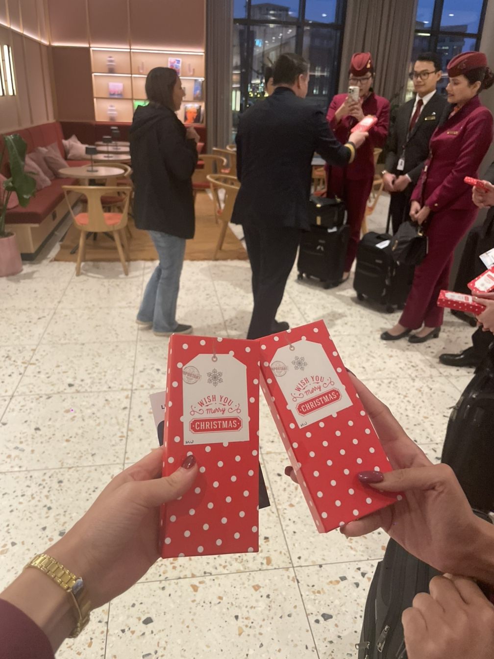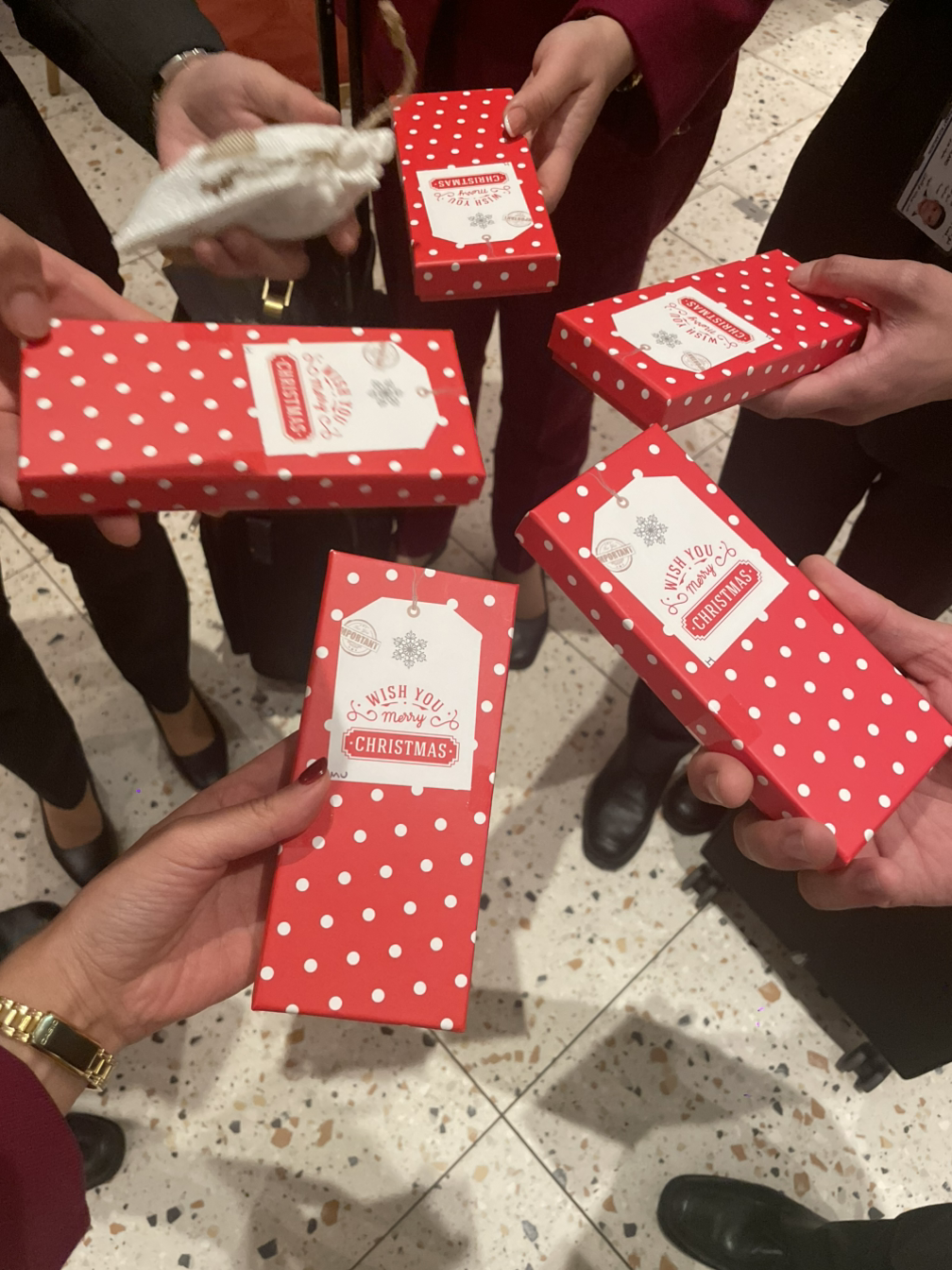 우리는 특별한 날들에도 비행을 해야 할 때도 있고 가족이나 사랑하는 사람들과 함께 할 수 없을 경우가 많다고 했다. 이렇게 일하는 우리 모두에게 감사의 인사를 전했다. 기장님은 아이 네 명이 있다고 했다. 이번 비행엔 아내와 막내아들이 따라왔다. 크리스마스를 모두가 기념하는지는 모르겠지만 아내와 준비했다며 깜짝 선물박스를 꺼내셨다. 한 명 한 명 기장님과 아내분은 눈을 마주치며 메리크리스마스와 당신을 위해 준비를 했다며 선물박스를 나누어주셨다.