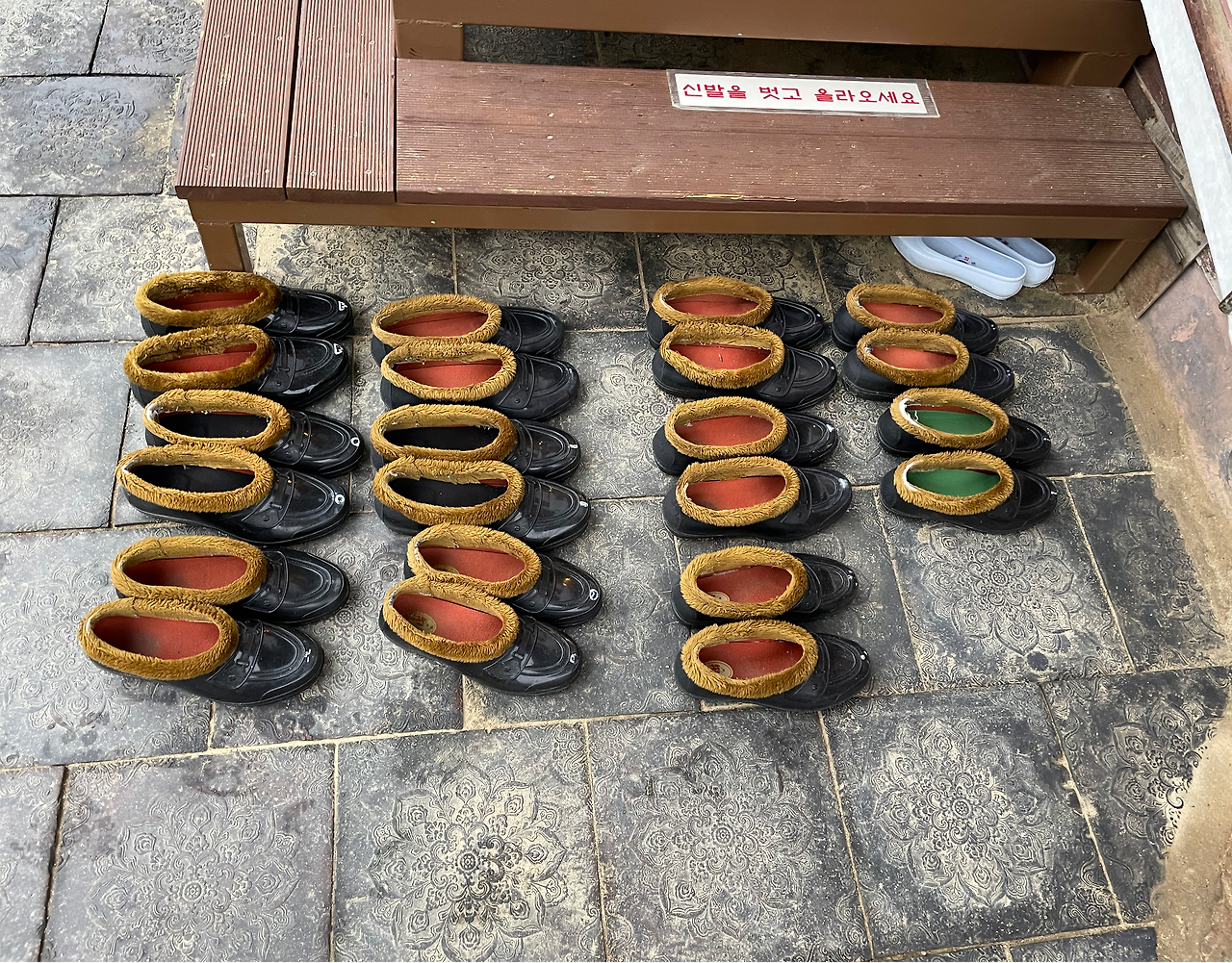 원래 이렇게 일찍 일어나서 밥을 먹지 않던 터라 가볍게 조금만 먹고 먼저 나와 아침(나에게는 새벽) 산책을 했다. 유네스코 문화유산인 팔만대장경, 초등학교 때인가 중학교 국사 시간에 배운 것 같았는데 그 역사가 바로 여기 있다니 경이로웠다. 팔만대장경판 앞에 설명 문구를 다 읽고 주변을 서성이다 해인사 메인 절로 보이는 공간으로 갔다. 그런데 많은 스님들이 차례로 신발을 벗고 들어가는 게 아닌가. 머리 스타일도 옷도, 신발도 똑같았다. 나올 때 신발을 어떻게 구분할까 궁금하여 신발에 조금 가까이 다가가 보았더니 신발 앞에 하얀색으로 무늬를 표시해 놓았다. 난 개인적으로 왕관 그림이 맘에 들었다. 저 브랜드를 좋아하시나 아니면 원래 패션에 관심이 많던 스님일까.