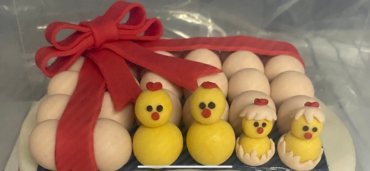 귀여운 계란 한 판 케이크. 픽업하는 데 왕복 4시간을 썼다. 두 번째 병아리는 이동 중에 부딪혀 벼슬과 부리가 납작해졌다.
