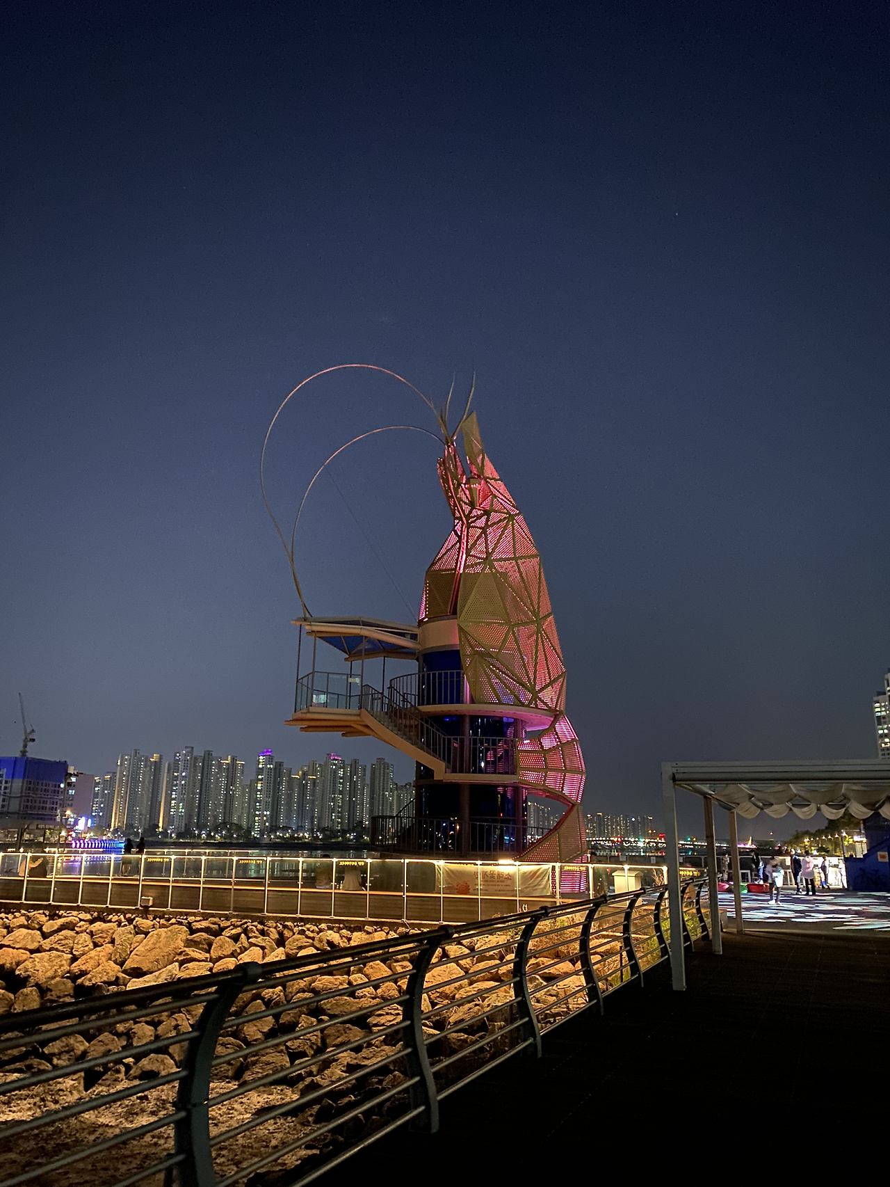 1번 출구로 나와 왼쪽으로 쭉 내려가니 커다란 꽃게상이 나를 반겨주었다. 지도상으로는 해오름 광장이라고 했다. 옆에는 어른부터 아이까지 마실 수 있도록 키에 맞춰 단차를 둔 음수대가 있었는데 음수대마저도 새우 모양이었다. 소래포구의 명물 새우탑까지 쭉 펼쳐진 산책로는 아주 폭이 넓고 길었다. 시야가 탁 트여 있어 주변 풍경이 멀리까지 한눈에 들어왔다. 새우탑은 꽤 멀리 있었는데 얼마나 거대한지 뾰족한 새우 머리와 동그랗게 말린 수염이 생생하게 잘 보였다. 여러모로 신선한 풍경이었다.