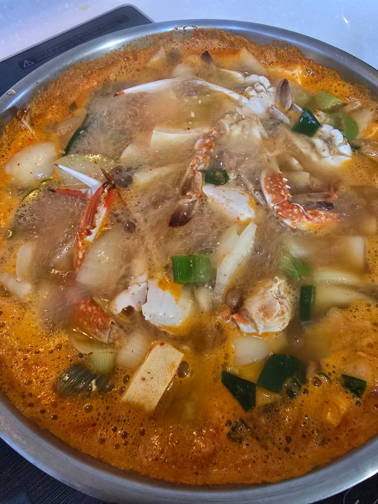 재료: 주재료(꽃게, 차돌박이, 소고기, 배추, 시금치, 어묵 ) 무엇이든 ok! 양파, 대파, 두부, 감자, 애호박, 무, 버섯류, 된장, 고춧가루, 다진 마늘