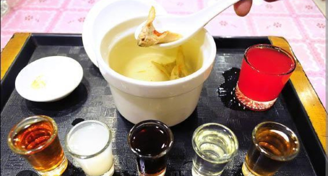 선생님은 대표메뉴 하나만 주문해서 그냥 구경만 하자고 하셨다. 속으로 다행이다 싶었다. 세트메뉴 하나만 주문해서 맛보고 싶은 사람만 맛보기로 했다. 잠시 후 쟁반 같은 곳에 맑은 탕 한 그릇과 소주잔에 담긴 빨간색 액체, 그리고 다섯 개의 작은 유리잔에 각각 다른 색깔의 액체가 담겨 나왔다.