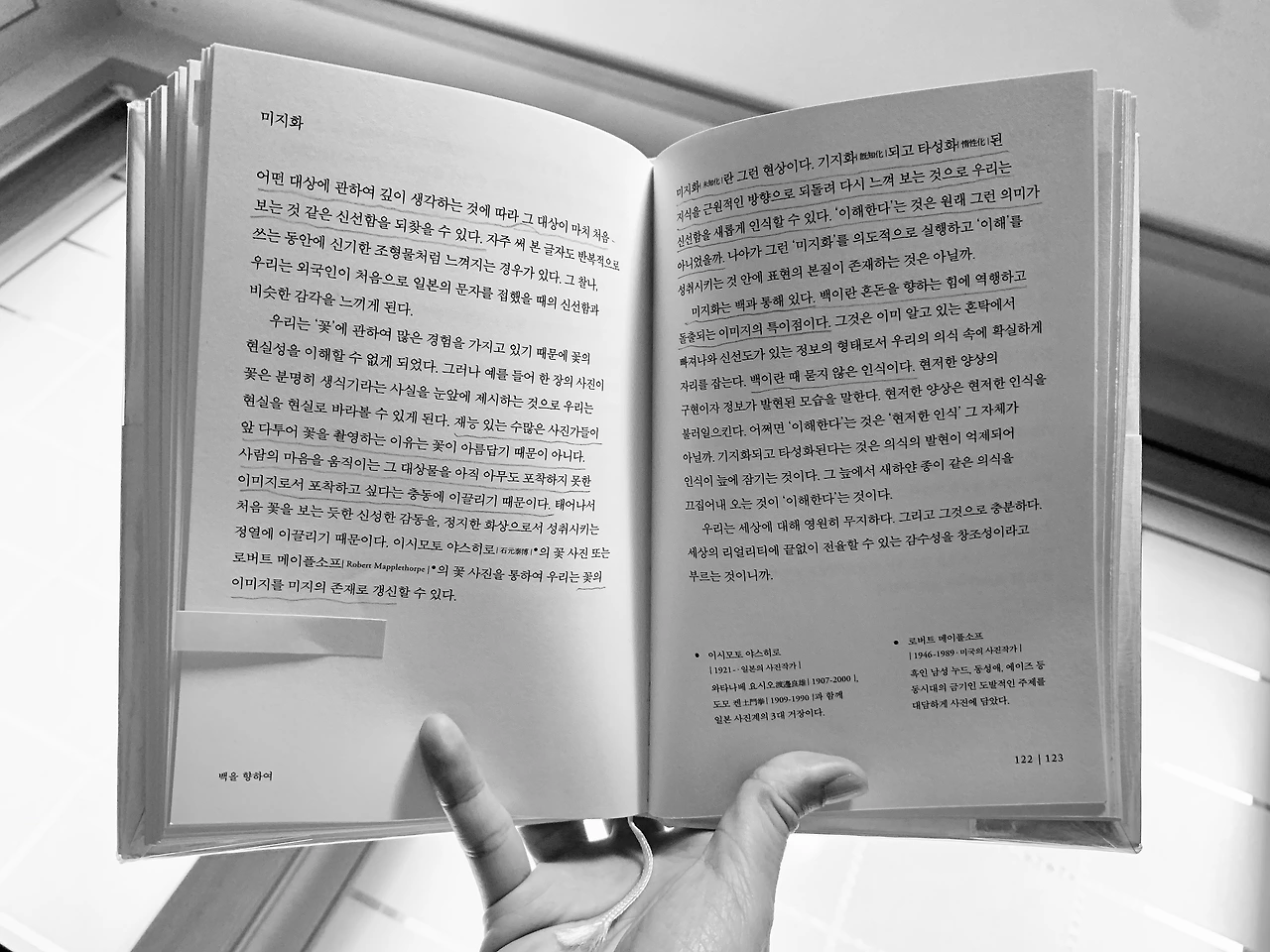 작년에 공개 스피치를 했는데 준비하면서 스크립트를 썼어요. 글을 쓰면서 제 눈으로 계속 제 이야기를 보잖아요. 매일 반복해서 마주하니까 어느 순간부터 저에게 너무 익숙한 대상이 되는 거예요. 그러면서 한편으로는 낯설게 느껴졌어요. 하라 켄야의 <백白>이라는 책이 있어요. 흰색에 관해서 쓴 책인데 '미지화(未知化)'라는 단어가 나와요. 같은 대상도 깊이 생각하는 것에 따라 처음 보는 것 같은 신선함을 느끼게 된다는 말이예요. 익숙한 대상인데 계속 주시하고 있으면 어느 순간 낯설게 보이는 거죠.