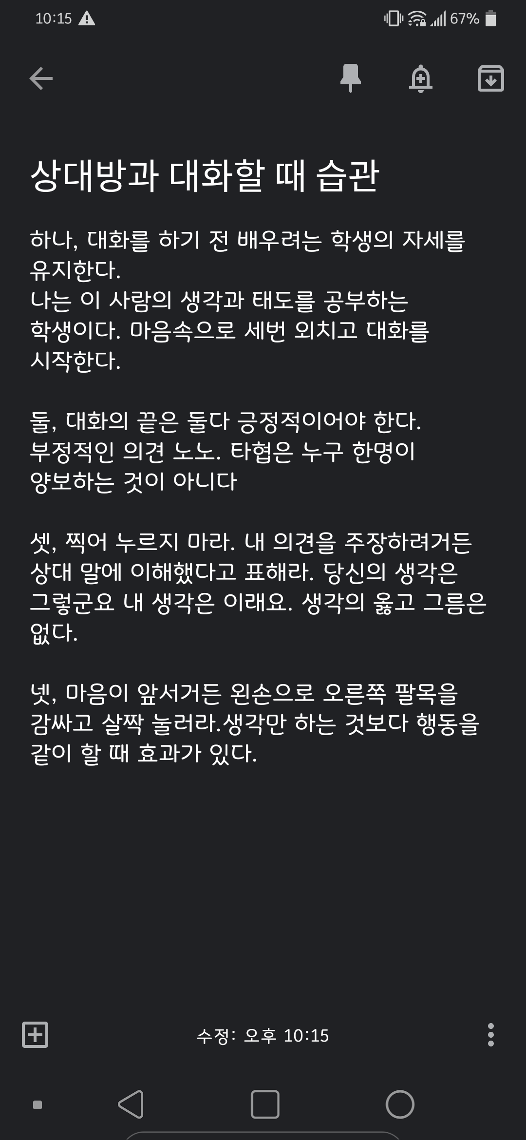집 가는 길에 이렇게 대화하면 좋지 않다는 걸 느껴서 어떻게 하면 고칠 수 있을지 고민했거든요. 뭐가 문제였는지 하나하나 생각해보면서 네 가지를 만들었어요. 효과가 확 있지는 않았는데 그래도 대화할 때 제 말을 너무 많이 하거나 상대의 의견을 부정하는 말을 하지 않도록 조금 더 자제할 수 있게 된 것 같아요.