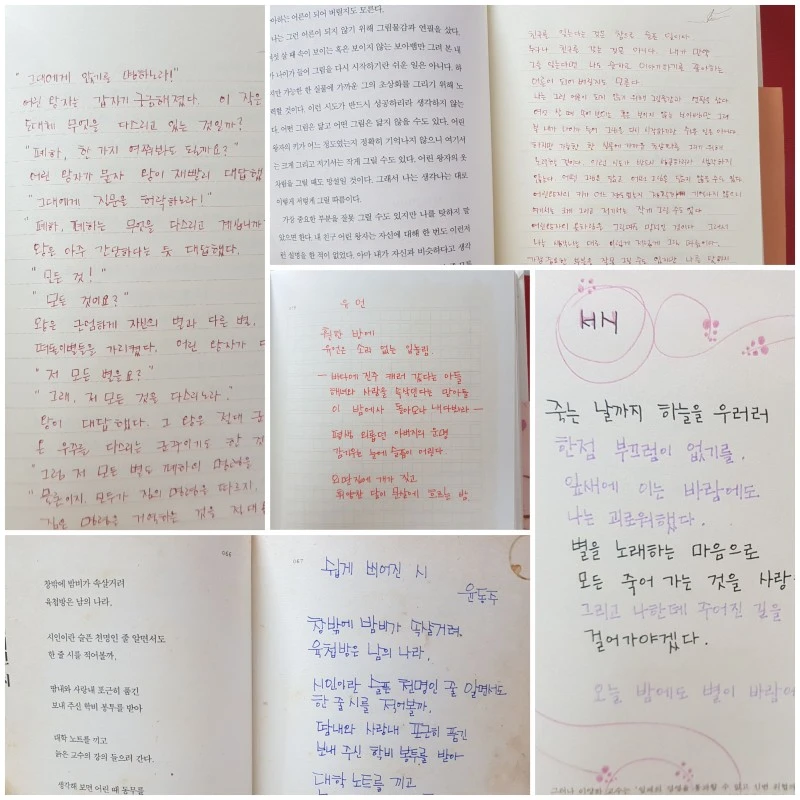 제가 힘들 때 필사를 했거든요. 너무 힘드니까 아침에 일어나서 눈만 뜨면 <어린 왕자> 책을 필사했어요. 자기 전에는 윤동주 시를 짧게 쓰고 아침에 눈 뜨면 <어린 왕자> 책을 필사했거든요. 아침에 필사를 하고 나면 무언가를 할 에너지가 생기더라고요. 처음에는 움직이기도 싫어서 침대에만 누워있었거든요. 먼저 필사를 하고 에너지가 생기면 밥도 하고 청소도 하고 아이들 깨워서 학교도 보내고 그랬던 것 같아요. 그런 과정을 통해 어느 정도 치유가 됐다는 생각이 드니까 다른 사람들한테도 알려주면 좋겠다는 생각이 들었던 것 같아요. 그때는 그런 생각을 못 했는데 지나고 보니 그래요.