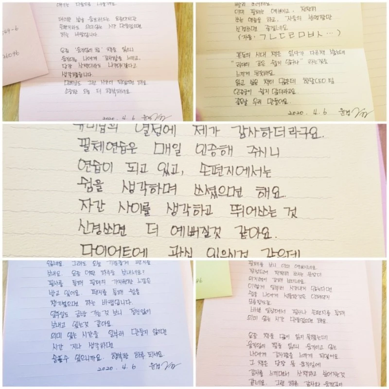 성인들한테도 좋지만 학생들한테 정말 좋을 것 같아요. 이 프로그램을 프로젝트처럼 만들어서 구청이나 도서관에서 해보고 싶다는 생각을 많이 했었어요. 그런데 신청한 사람이 100명이면 제가 다 답장을 해줄 수가 없잖아요. 이번에 6명한테 했는데도 편지 쓰는 시간이 3시간 정도 걸리더라고요. 마음처럼 쉬운 일이 아니라는 걸 알았어요. 유진 님은 편지쓰기 어떻게 시작하게 되셨어요?