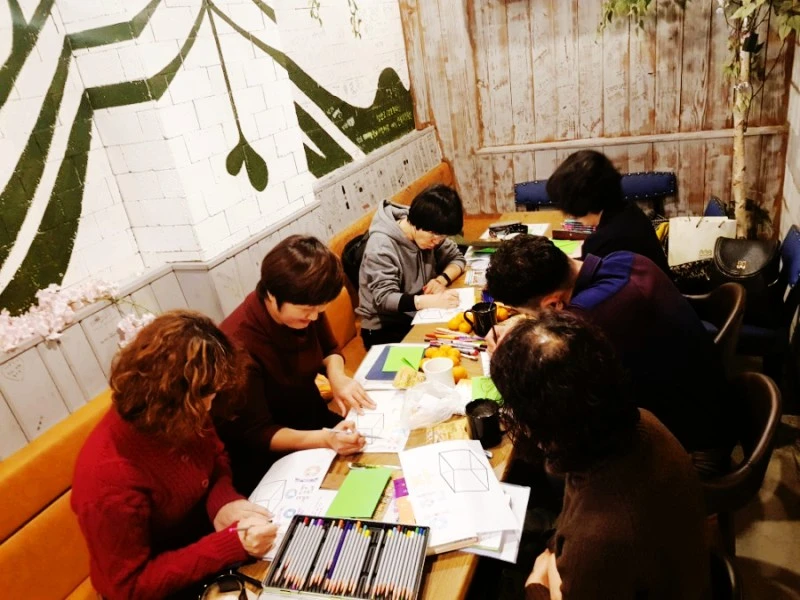 컬러링 시간이 너무 좋아요. 수업 첫 번째 타임이 컬러링이거든요. 사람들이 처음 만나면 서먹서먹하잖아요. 그런데 제가 컬러링 도안을 드리면서 색칠을 시작하면 엄청 편안해하세요. 컬러링 색을 다양하게 하거든요. 색채 심리 상담에도 관심이 많아서 그 부분에 관해 같이 이야기를 나눠요. 결국 서로 편하게 대화를 나누니까 평온한 시간이 되는 거예요.