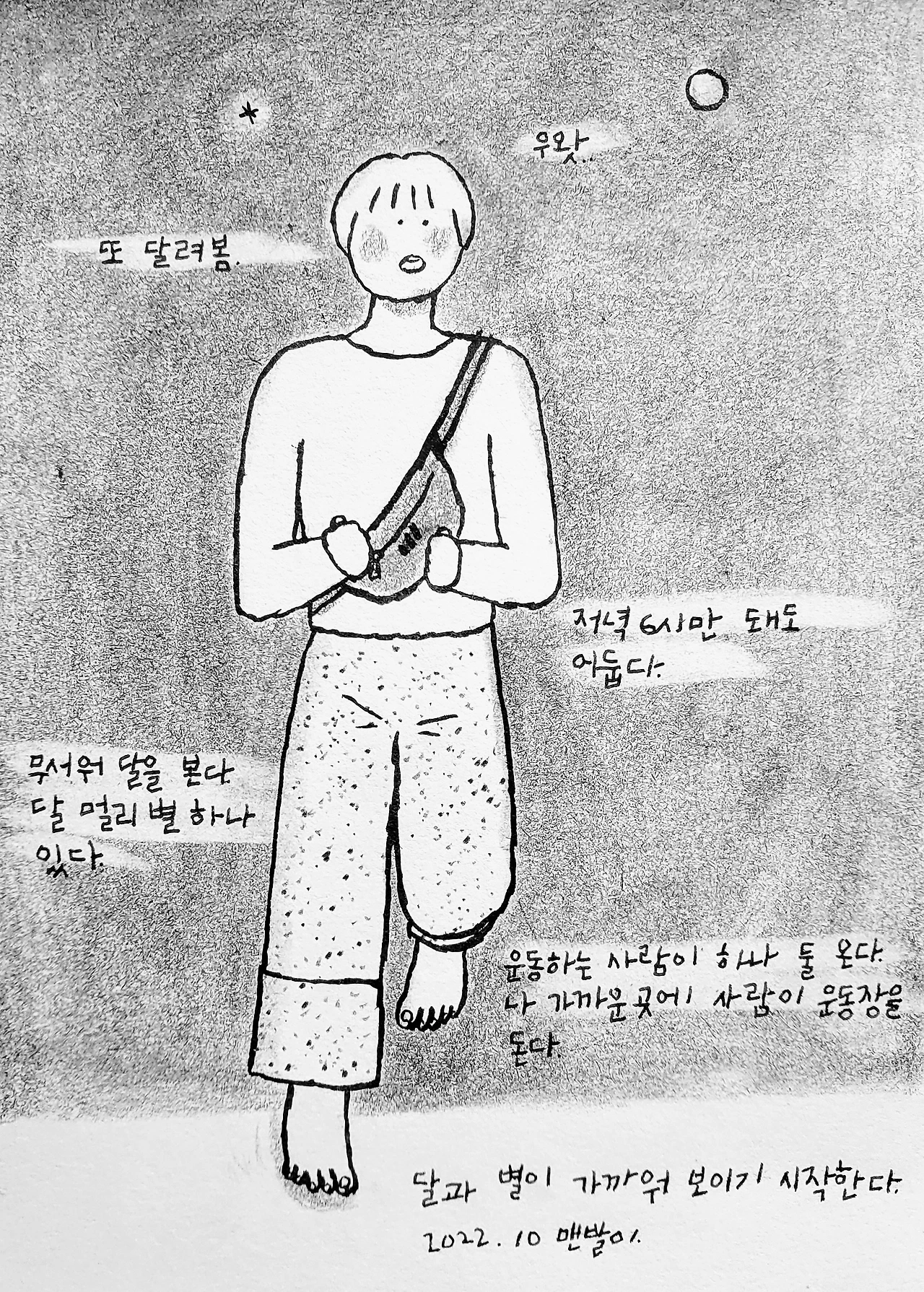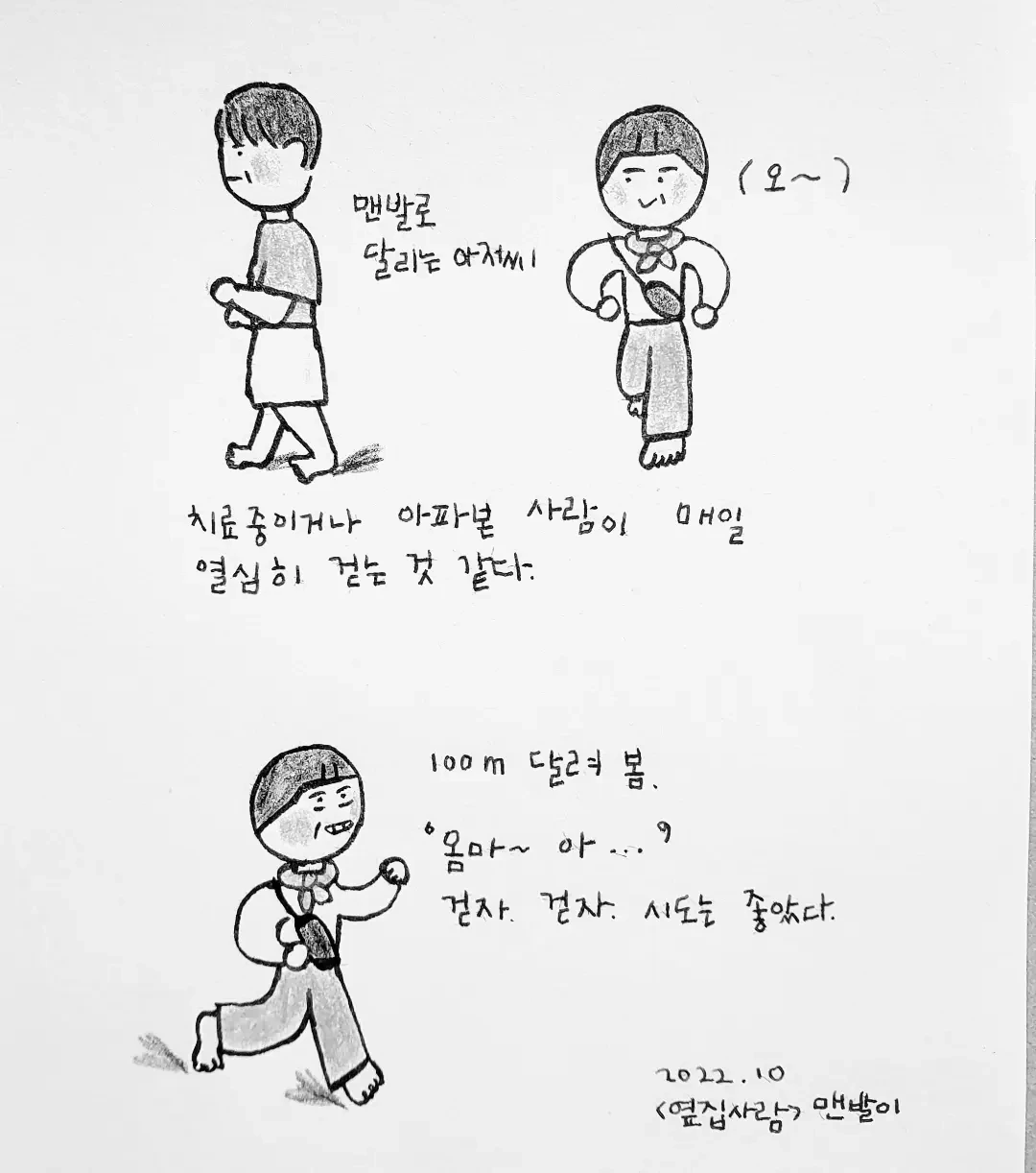 1인 가구의 편함과 여유로움 사이사이 적적한 마음이 들면 큰 종이에 그림을 그렸다. 그림과 마주하고 질문의 답을 그 안에서 찾아보려고 했다. 무리가 됐던지 목과 팔이 아팠다. 지금은 그런 적적한 마음이 들면 책에서읽은 방법대로 마음을 지켜본다. 잠깐 읽고 잠깐 쓰고 꼭 해야 하는 것만 그리고 걷기로 바뀌었다.맨발로 걸으면 염증과 통증이 준다는 글을 보고 걷기에 집중했다.