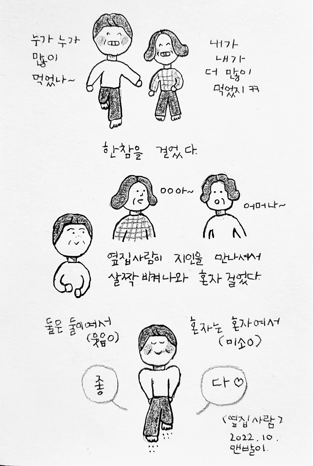 둘이 걸을 때는 한참을 걸으며 웃었다. 혼자 걸을 때는 조용히 미소만 지으며 오래 걷지는 않았다.