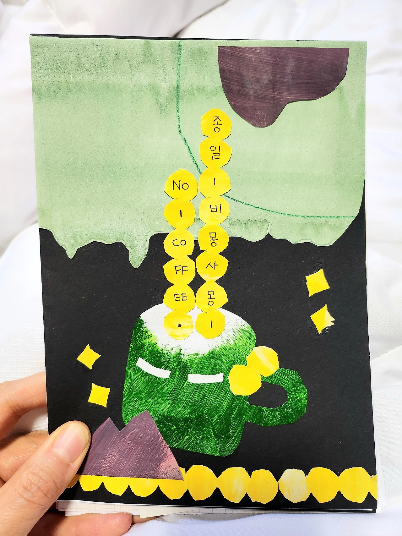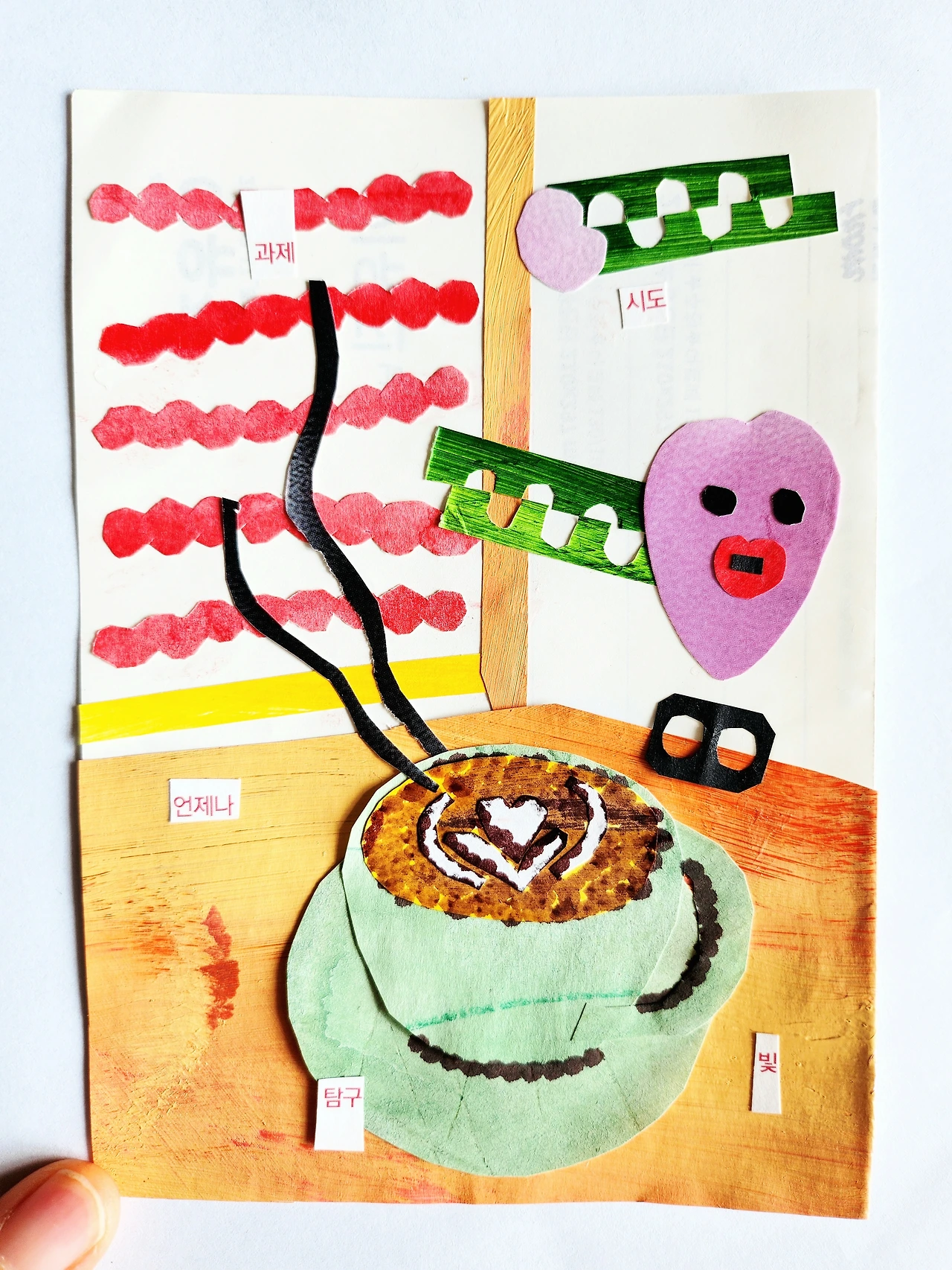 콜라주 작업으로 그림을 그리며 자신을 관찰하는 시간의 기록이다. 상상의 얼굴로 시작해 오늘부터는 잠깐 멀리하는 커피를 그림으로 마시려고 한다.