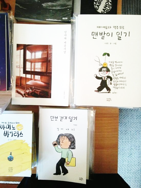 있나 찾아본다. 그림책과 만화책, 그래픽 노블을 좋아한다. 은유 작가님과 김목인 작가님의 책이 있는지 살폈다. 독립출판물에도 관심이 많다. 독립출판물 쪽에 보면 내가 제작한 책 두 권이 두 발을 뻗고 누워있다. <맨발이 일기>와 <만보 걷기 일기>이다. 표지를 정할 때는 생각 못 했는데 앞표지의 사람이 걸어가고 있다. 프리랜서의 시간을 쌓다 보니 약간의 조급증이 생겼고 그 마음에 고른 그림은, 책을 가장 잘 나타내는 그림은, 두 팔을 힘차게 흔들고 두 발을 벌려 걷는 모습이다. 카프카의 밤 책방에서는 책장에 꽂혀 서있지 않고 테이블에 잘 누워 있어서 좋다. 휴우 하고 쉬고 있는 것 같다. 각자 어울리는 책방의 손님을 만나 잘 실려가길 바란다.