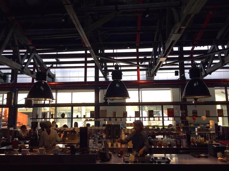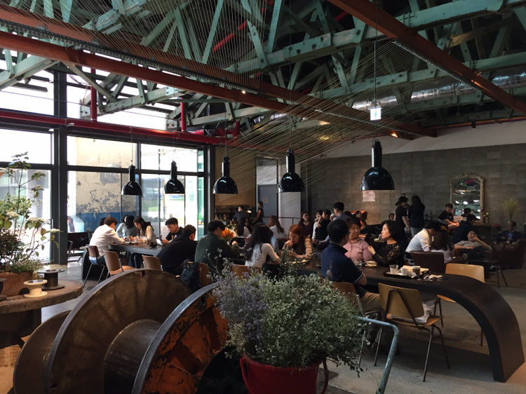 안쪽에서 본 카페 테라로사의 전경이 퍽 이채롭다. 공장이면서 카페, 카페이면서 공장인 모습.