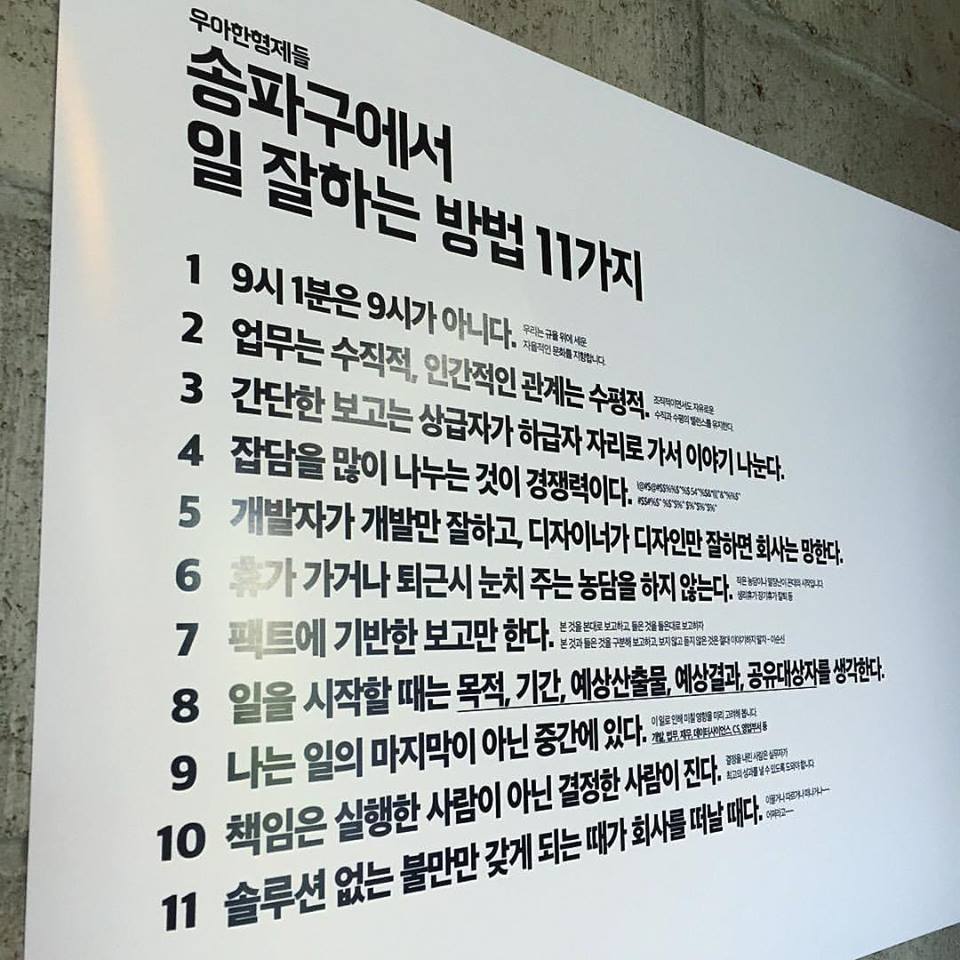 하지만 개중에 가장 명쾌하고 내게 공감되는 정리는, 많은 사람들이 이미 잘 알고 계실 송파구에서 일 잘하는 방법 11가지 by 우아한형제들. (아래 이미지 참조) 당연한 말 같으면서도, 많은 회사에서 제대로 지켜지지 않는 것들. 중요한 11가지만 추리고 추렸겠지만, 그중에서도 특히나 주니어/신입사원에게는 1,7,8,9번이 가장 중요하리라 생각해본다.