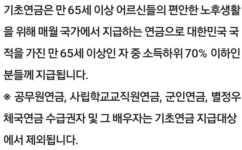 둘째, 공무원을 10년 이상하면 기초 연금을 못 받는다. 65세 이후 소득하위 70%이하면 기초연금을 받을 수 있지만 10년 이상 근무한 공무원 중 소득하위 70%이하여도 본인 및 배우자도 기초연금을 받지 못한다. 단, 연금 최소 가입 기간(10년)을 채우지 못하고 퇴직해 '퇴직일시금'을 받은 경우에는 기초연금을 받을 수 있다.