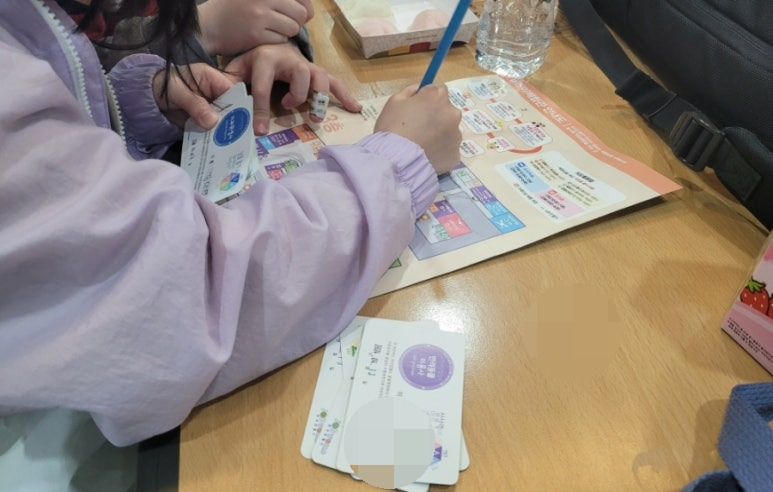 직업 체험과 쇼핑을 마무리한 후, 배고픈 아이들을 데리고 2층 편의점에 들러 간식을 샀다. 테이블에 앉아 둘째는 자신이 만든 떡과 편의점에서 고른 과자를 먹으며 아쉬움을 달랬고, 첫째는 간식은 먹지 않고 가지고 있던 카드와 이번에 받은 카드를 꺼내 앞으로 무엇을 체험할지 고민했다.