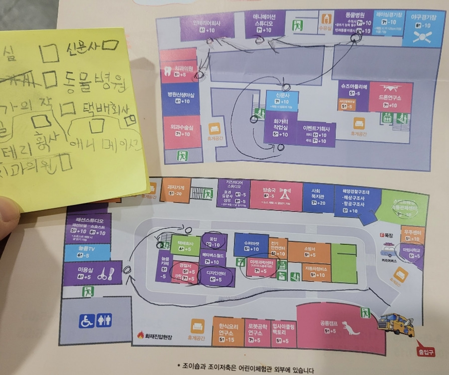 음식이 나오기 전, 첫째는 팸플릿을 보며 작전을 짜고 있었다. 하고 싶은 체험을 쭉 적고, 각 체험에서 조이(잡월드 안에서는 통용되는 화폐)를 버는 활동과 쓰는 활동을 확인하여 체험 목록을 구성했다. 둘째는 하고 싶은 체험을 골랐다. 결과적으로 첫째가 6개, 둘째가 5개의 활동을 했다. 둘째는 원하는 체험을 하기 위해 한 타임을 오롯이 기다리는 데 써서 활동 수가 적었다. 세 시간 후, 두 아이 모두 만족하며 체험장에서 나왔다.