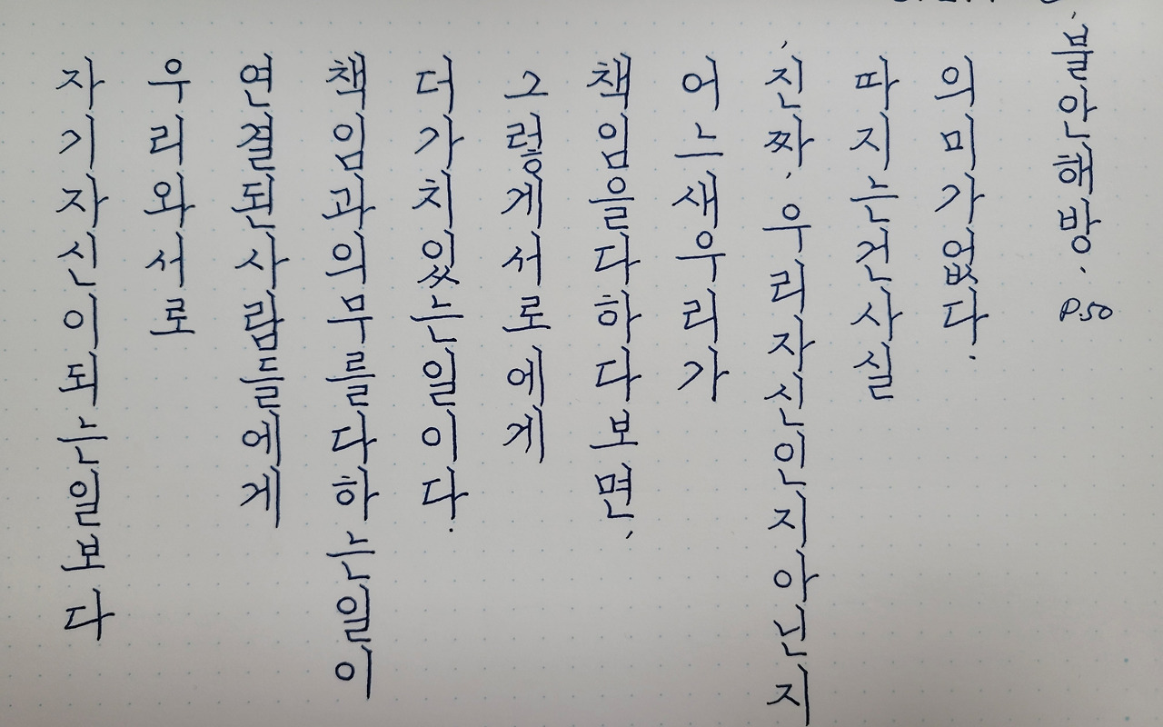 습관이 참 무섭다. 그 난리를 피우고 다음날 아침, 평소보다 늦긴 했지만 7시에 일어나 책을 읽고 필사를 했다. 이 상황에서 책이 머릿속에 들어가겠냐마는 내가 할 수 있는 일은 이것밖에 없다. 그리고 책 속의 한마디가 생각났다. '그래도 인생은 흐른다.'