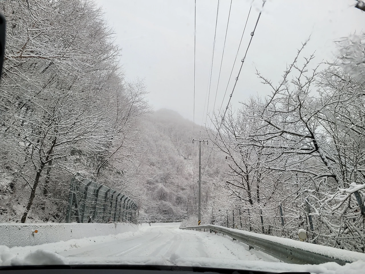 우리 차는 겨울용 타이어로 교체한 것인데, 스노 체인은 생각 못했다고 남편은 아쉬워했다. 산을 내려오던 내려오던 4륜구동 SUV외제차가 방향을 바꾸다 멈췄다. 남편은 그 차에 가본다고 나갔다. 주변에는 눈 외에 아무것도 보이지 않는다. 아름답지만 무서웠다. 어느덧 점심시간이 되어 아이들에게 차에 있던 과자와 물을 주었다.