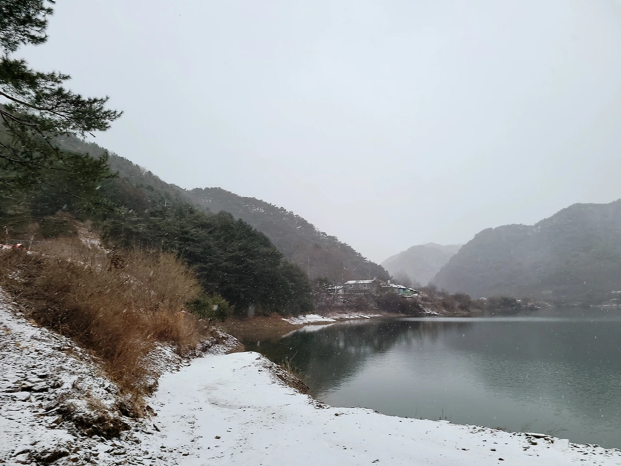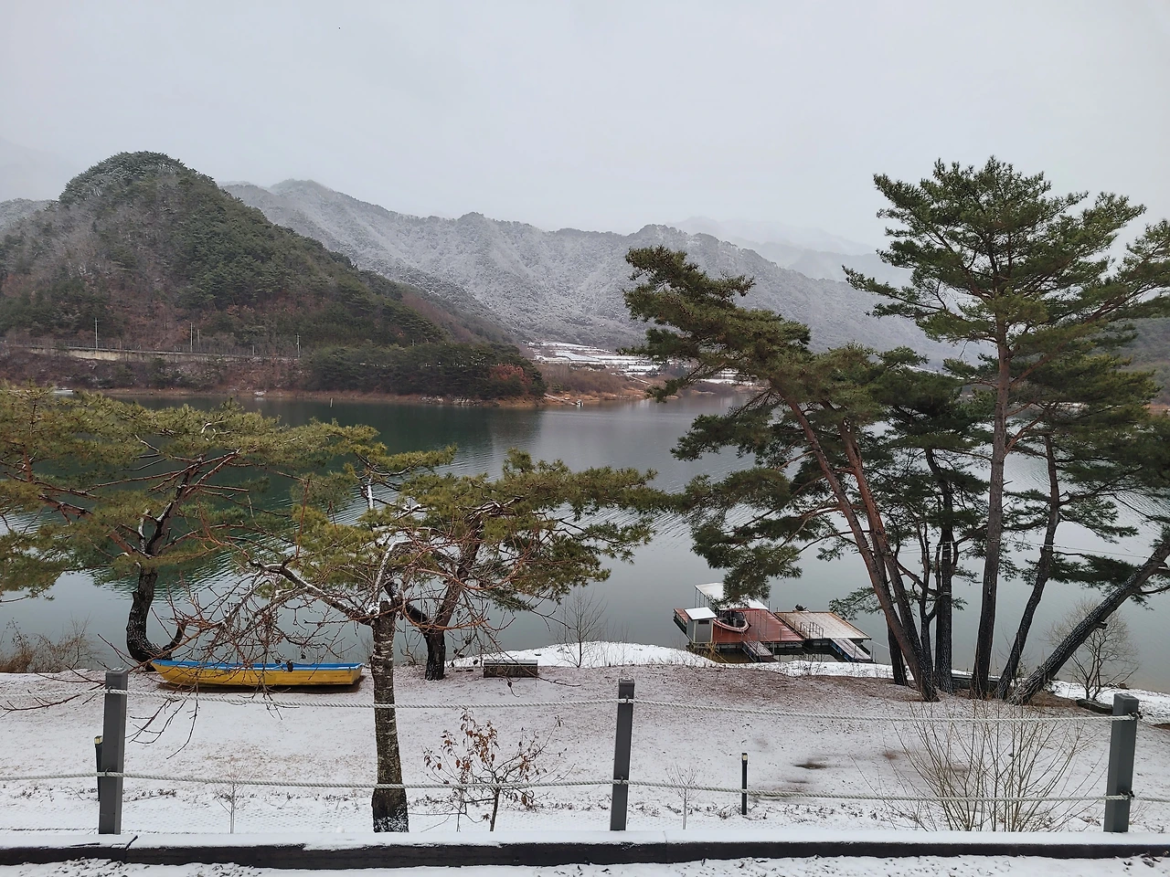 아름다웠다. 호수도 풍경도, 조용한 아침 공기도 신선했다. 아침에 눈이 내려 바닥에 살짝 쌓였다.