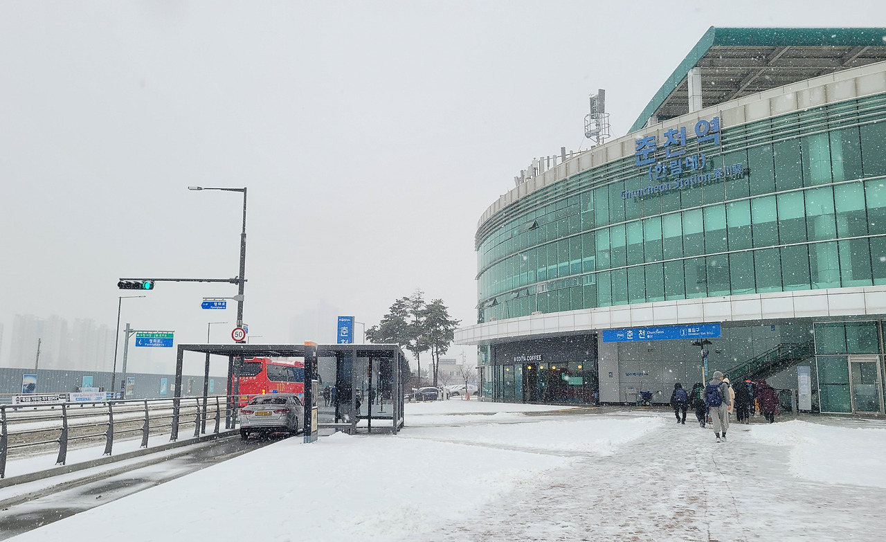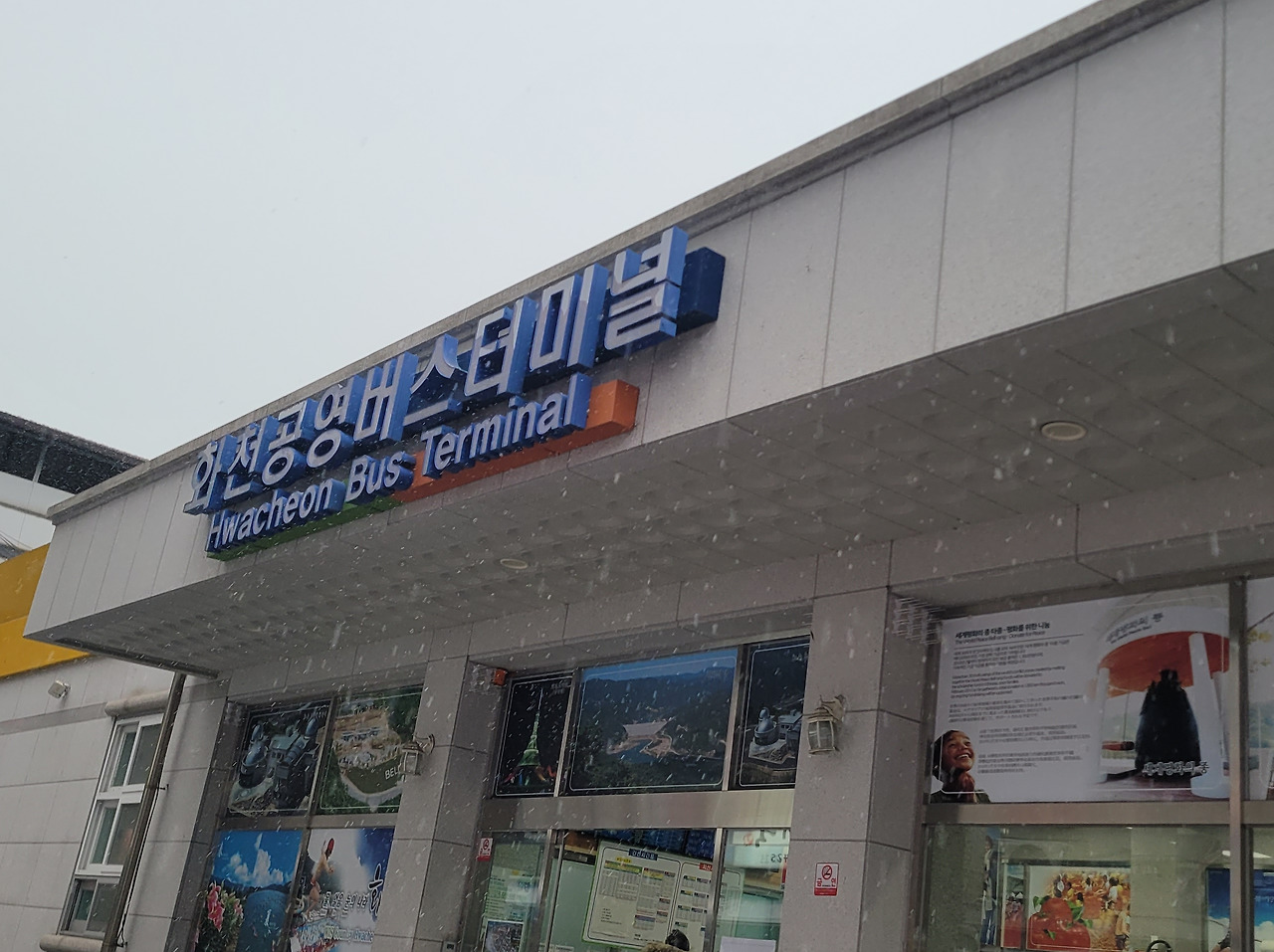 다행히 화천 시외버스정류장은 가까운 곳에 있었다. 작년에 힘들게 고갯길에 내려와서 밥 먹던 분식점 맞은편이 시외버스 정류장이니까... 낯이 익다. 정류장에 들어가서 버스 시간을 확인했다. 누군가 가게 앞의 눈을 쓸고 있다. 그런데 쓸고 나서 뒤돌아서면 그 위에 눈이 다시 쌓이고 있었다.