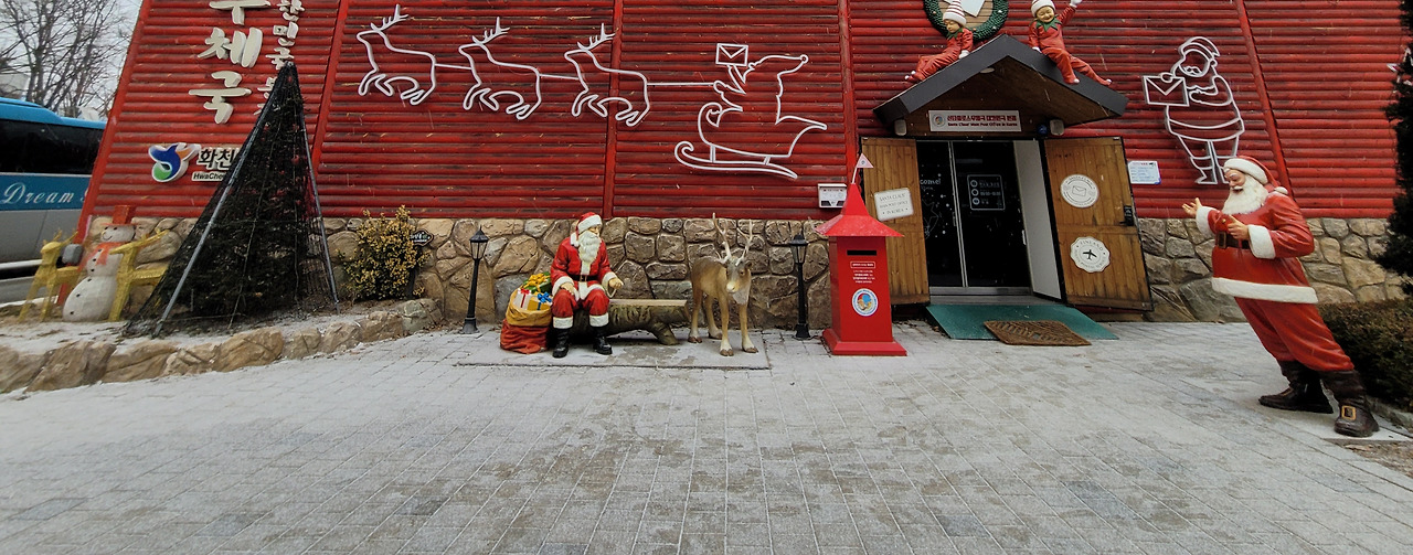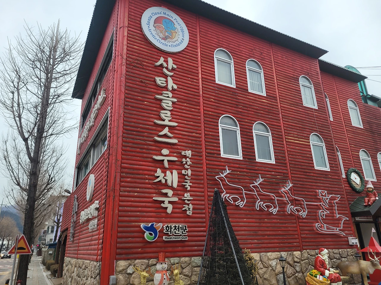 다음날 우리는 지난번보다 한 시간 일찍 일어나 식사를 하고 짐을 쌌다. 출발할 때 작년처럼 눈발이 날리기 시작했지만 여긴 평지라 괜찮다. 길에서 오늘까지 화천 우체국에서 산타와 사진을 찍을 수 있다는 플래카드를 보았다. 우린 시간 여유가 있으니 산타우체국에 들러 추억을 하나 만들기로 했다. 행사장을 가는 길에 마침 저 너머로 빨간 산타우체국이 눈에 들어온다. 이쪽으로 오길 참 잘했다. 남편에게 저기 들러 사진 하나 찍고 오자고 했다. 그리고 주차를 하려고 골목길로 들어섰다.