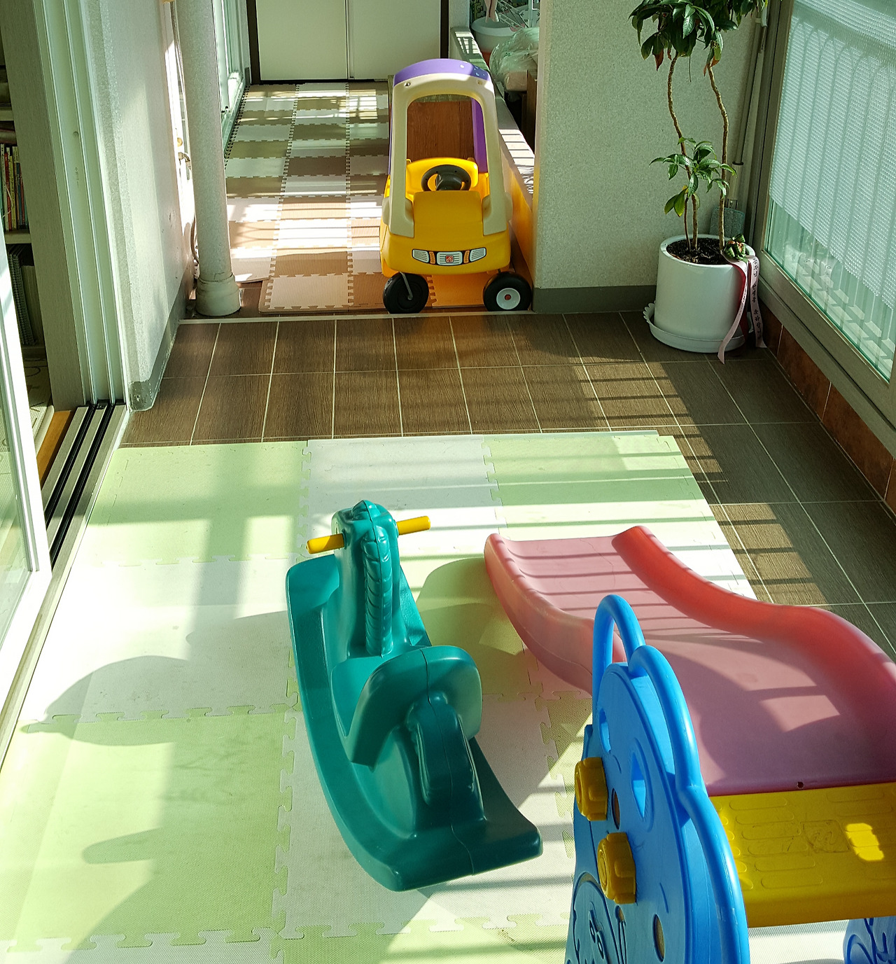 베란다. 연두색 매트만 구입, 나머지는 중고와 드림으로 구함. 총 만오천원.첫째를 어린이집 보내면서 미니멀살림을 시작했다. 대부분은 물려 받거나 중고로 구했고, 본전을 뽑을 만큼 오래 사용했다. 고민끝에 새것으로 샀지만 아이가 석달이상 찾지 않는 물건은 빠르게 정리했다. 물건이 적으니 물건을 찾는 수고도 없었고, 있는 물건을 또 사는 실수도 하지 않았다. 잠깐 필요한 물건은 사지 않고 갖고 있는 물건을 대체하여 썼다.