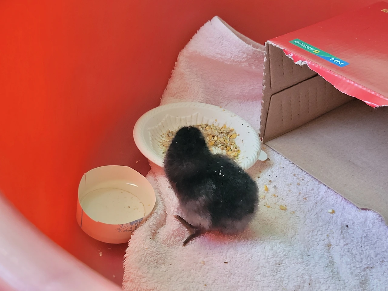 밖에서 일을 보고 들어와 보니 아이 목욕통으로 쓰던 빨간 대야에 수건이 깔려있고, 거기에 음료수 박스와 모이통이 있었다. 그리고 옆에 놓아둔 남편의 스마트 폰에서 자장가가 나오고 있었다. 병아리는 눈을 감고 비스듬히 기대서 잤다. 한참을 그러다 깼다.