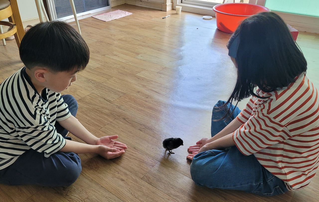 병아리는 깨서 방안을 이리저리 돌아다녔다. 익숙한 듯 몸을 떨지도 않았다. 그리곤 아이들 뒤를 졸졸 따라다녔다. 아이들이 자기를 보듬던 행동이 자신을 위한 것이라는 것을 안 것 같았다.