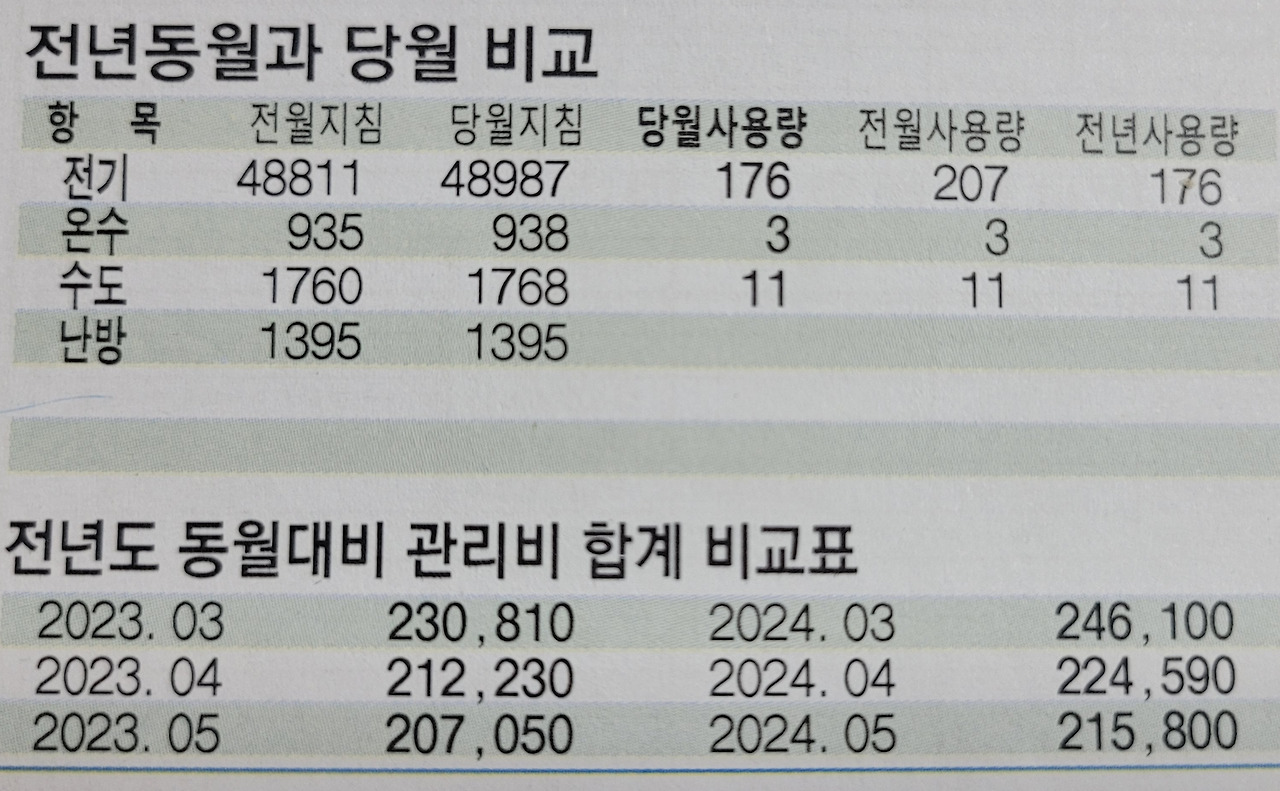 저희는 31평 아파트에 삽니다. 5월의 관리비는 21만 5천8백 원이네요. 5월은 에어컨도, 난방도 하지 않는 달이라 관리비가 부담스럽지는 않습니다. 하지만 물가가 올랐고, 에너지 사용료도 올랐습니다. 당월, 전월 전년 사용량은 모두 같지만 관리비는 전년에 비해 더 나오는 편입니다.
