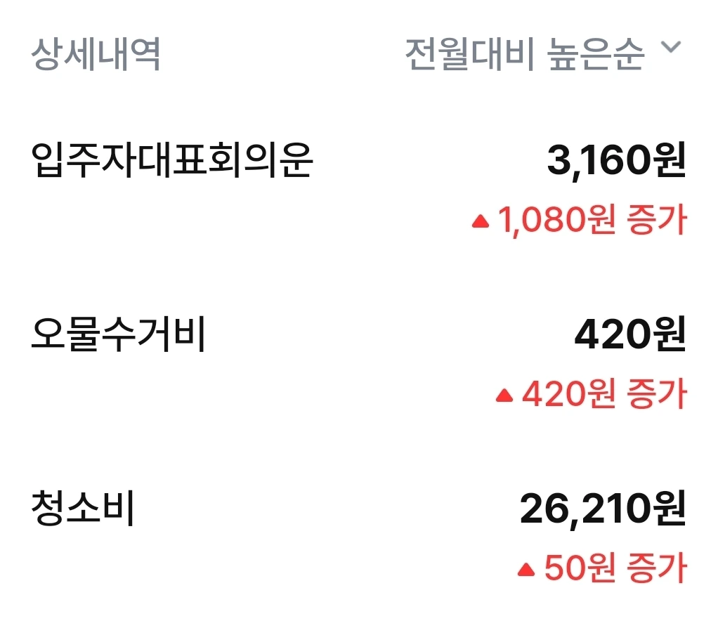 관리비 항목 중 50% 이상은 고정적으로 발생하는 비용입니다. 관리비, 승강기 유지비, 오물 수거비, 경비비, 화재보험료 등이요. 이 부분의 증감은 크게 의미가 없습니다. 왜냐하면 직접 통제할 수 있는 영역이 아니기 때문이지요. 따라서 이번달 증가한 관리비 항목에서는 신경 써야 할 요이은 없습니다.