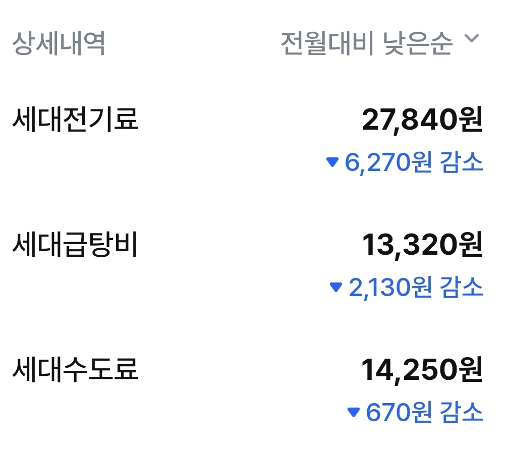 전기세와 급탕비순으로 사용료가 줄었습니다. 전기세가 줄이든 이유는 낮이 길어서 불을 늦게 켠 경향이 있을 것으로 추측됩니다. 수도료도 급탕비도 감소했습니다. 기온이 오르니 급탕비도 자연스레 줄어든 것 같이라 생각합니다.