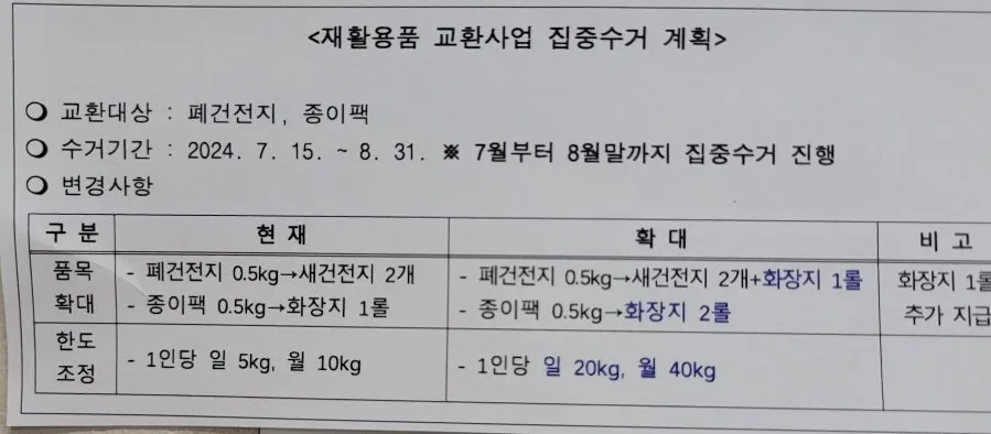 여섯 번째, 나는 고물장사.프라이팬, 냄비 이런 물건은 분리수거날 내놓지 않고 모아서 동네 고물상에 가서 돈 받고 판다. 그러면 한 끼 밥값은 나온다. 지금은 열심히 우유팩을 모으고 있다. 이거 모아서 동사무소 가져가면 휴지랑 교환해 준다. 올해 8월까지 휴지를 2배로 주는 기간이어서 열심히 모아다가 휴지 8롤을 받았다.