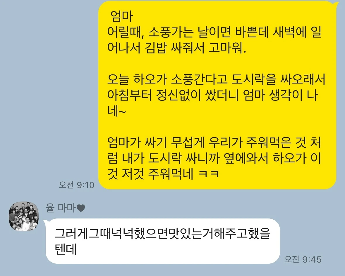 엄마에게 소풍날 김밥 싸주셔서 고맙다고 연락을 했다.그런데 엄마는 또 맛있는 거 못싸줬다고 미안해한다.