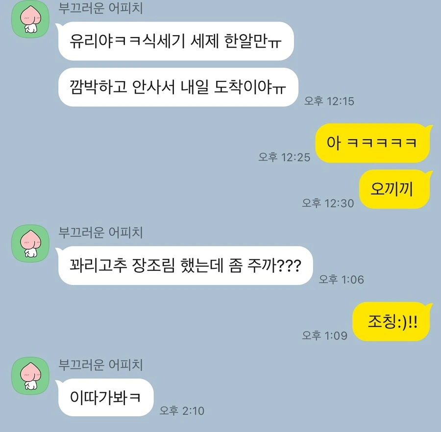 이 언니가 맨날 집에 고추 있니? 오이 있니? 마늘종 담갔는데 먹을래? 저녁 같이 먹을래? 이따 하원하고 잔디밭에 갈래? 커피 마실래? 물어본다.