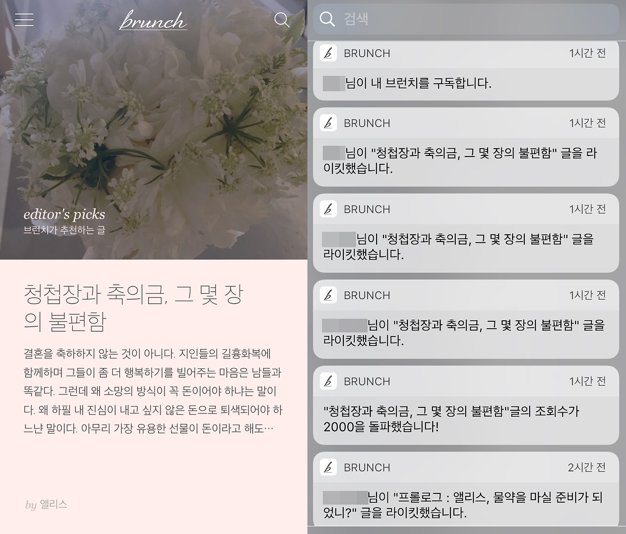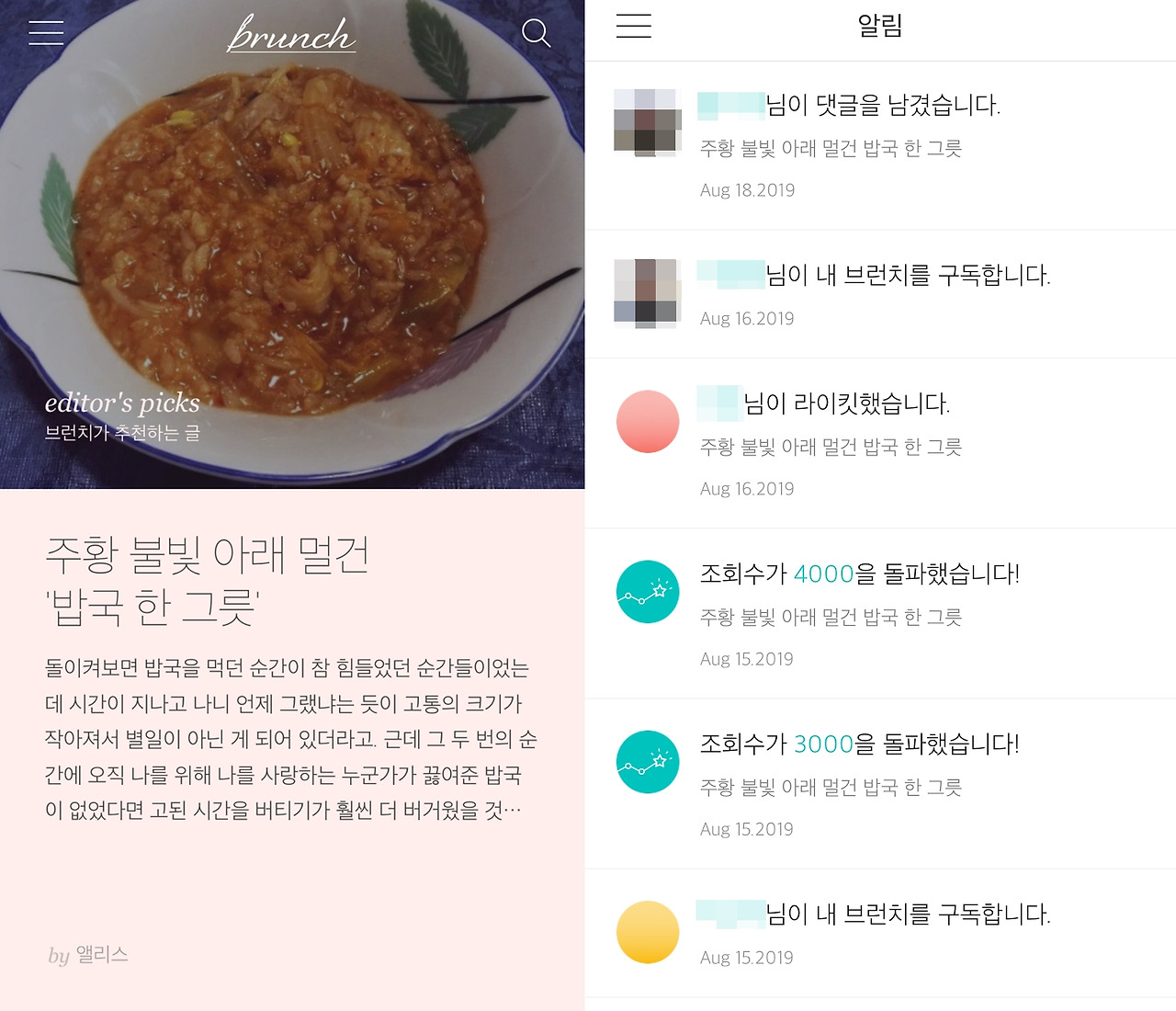 두 달 전 즈음에 브런치에 취업 준비의 시련과 엄마가 만들어줬던 소울푸드를 엮어 글을 한 편 썼는데 그 글이 '브런치가 추천하는 글'로 선정됐다.(brunch.co.kr/@youmni/13) 정신없던 어느 평일 날, 오후 1시가 되자마자 갑자기 브런치 앱 알람이 쉬지 않고 울렸다.