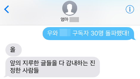 난생처음 참여해본 글쓰기 모임에서 윗글의 초본을 내고 합평을 했는데 모임 동료 중 몇몇이 글 내용 속 엄마의 피드백에 영향을 받았는지(그랬다고 믿고 싶다.) 역시 글이 지루하다는 반응을 보였다. 집에 돌아와서 "엄마, 애들이 내 글이 지루하대."라는 초등학생 수준의 푸념을 늘어놓다가 마음을 다잡고 퇴고를 거듭했다.