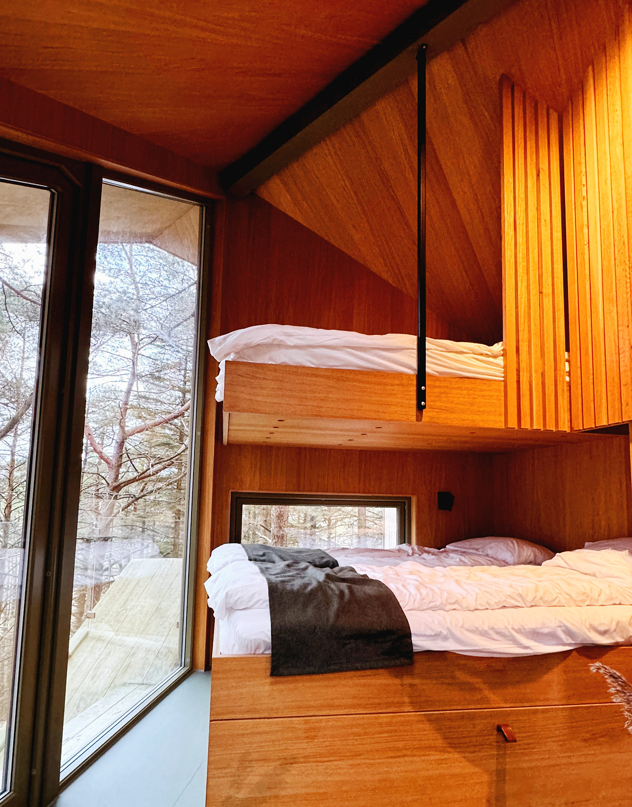 이 숲에는 단 두 채의 오두막집이 마주치지 않을 만큼의 거리에 자리잡고 있었고, 공용공간으로 미니 스파와 캠프파이어장이 있었다. 나무집 안에는 어느 호텔과도 비견될 만한 모던한 인테리어와 어메니티가 갖추어져 있었다.