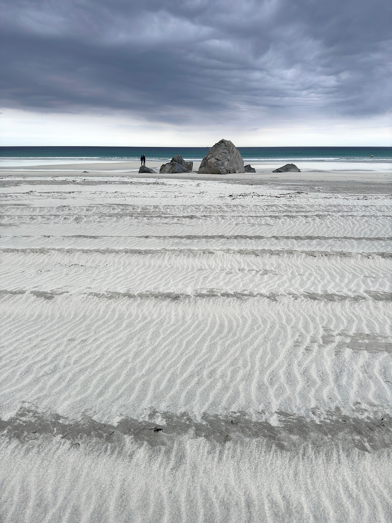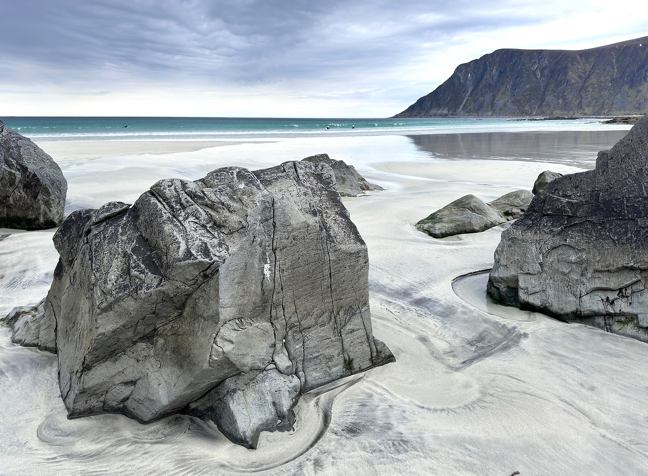 푸른 바다와 웅장한 산맥으로 둘러싸인 하얀 모래사장이 아름다운 해변을 향한다. 흰모래가 이토록 부드럽다니… 람베르그스트란다 Rambergstranda에서는 나무 침목으로 만든 좁은 산책로가 해변으로 이어졌다. 브룬스트란다 Brunstranda 넓은 백사장은 옥색 투명한 바다와 잔잔한 파도의 흔적으로 덮였다가 멀어진다. 아직 물은 차가웠는데 수영하는 현지인도 있었다. 이곳 사람들은 바다수영과 스키는 당연한 일상인 듯하다.